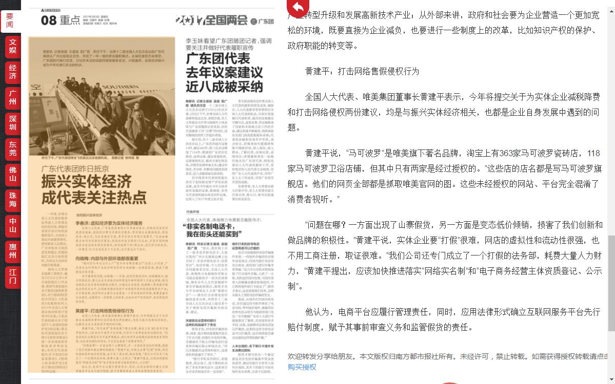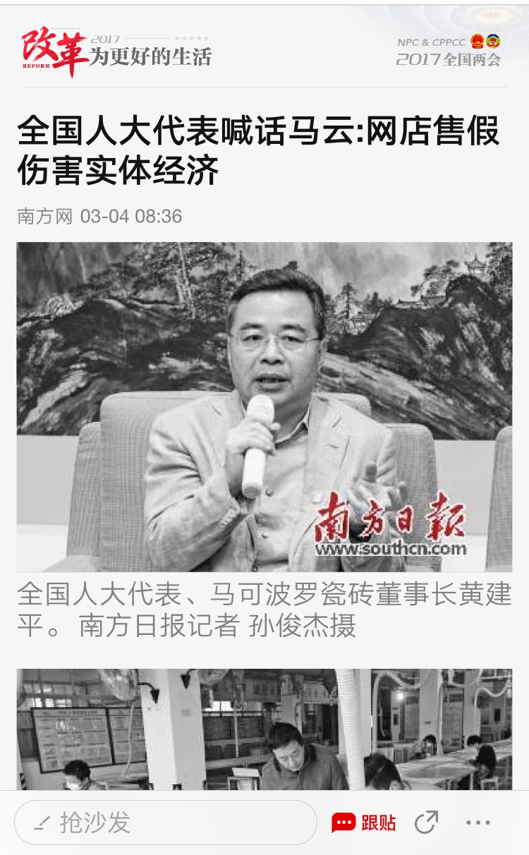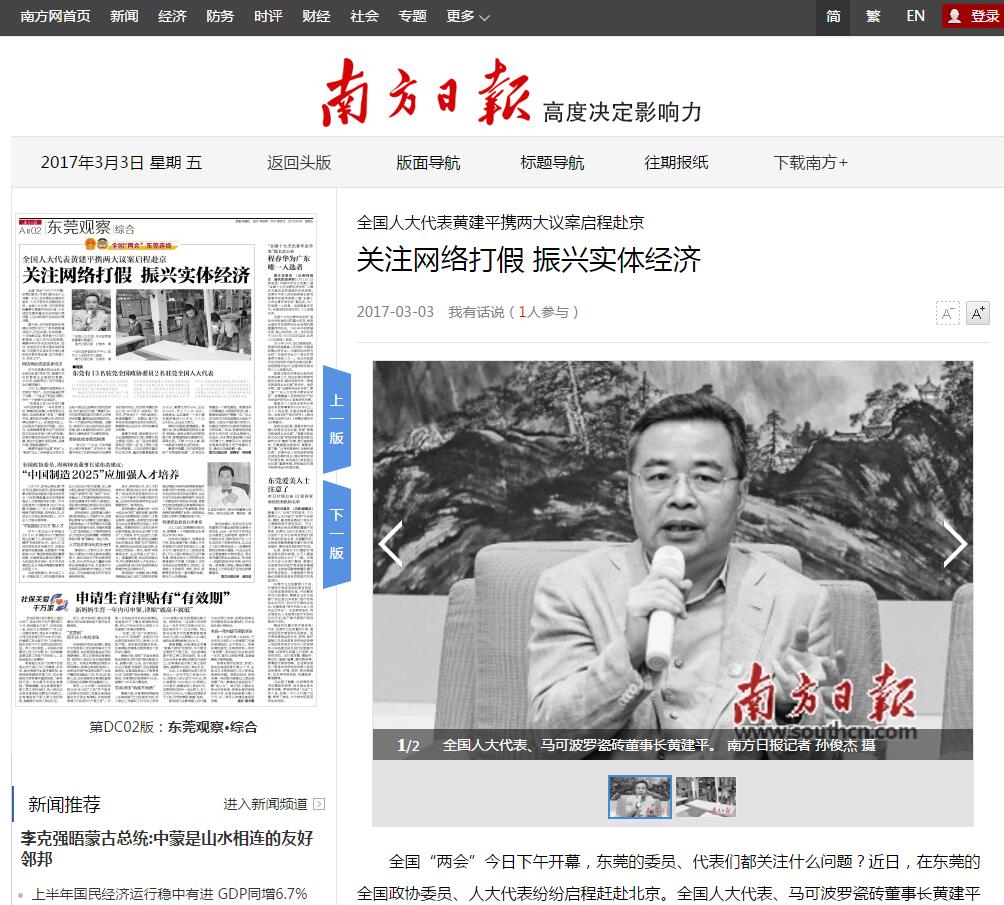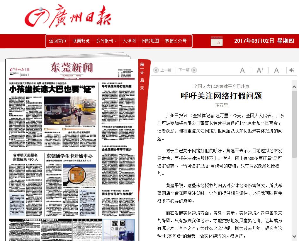 明天3月5日,第十二屆全國人大五次會議將正式開幕。作為建陶行業唯一的全國人大代表,馬可波羅瓷磚董事長黃建平已赴京參會。2017年董事長黃建平關于“打擊網絡售假侵權”的議案,已先期引起諸多關注,各媒體爭相報道!