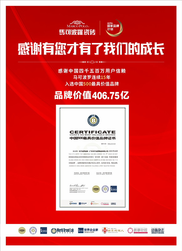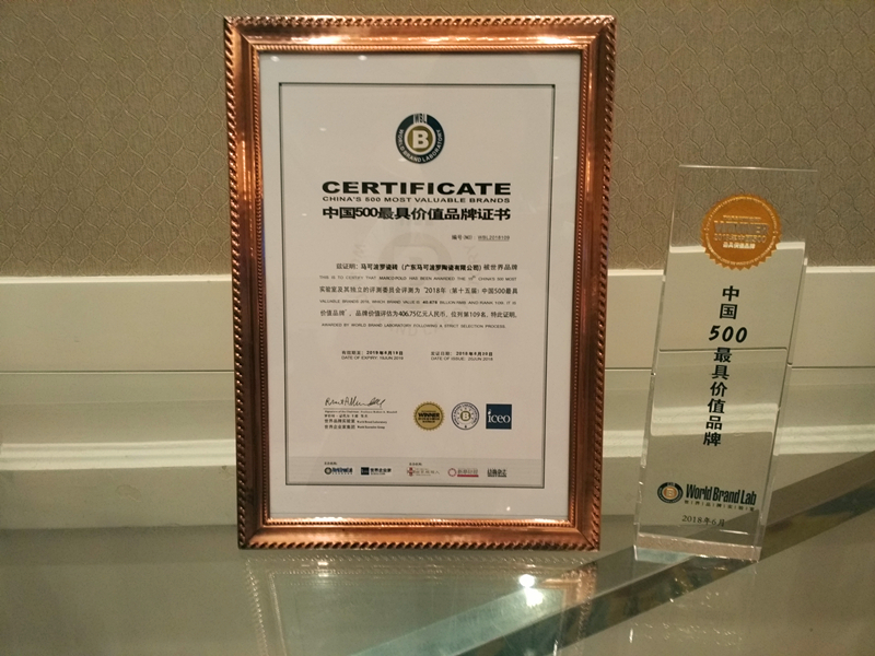 6月20日,全球三大品牌價值評估機構之一——世界品牌實驗室在京揭曉“2018年中國500最具價值品牌”榜單,馬可波羅瓷磚以406.75億品牌價值,名列榜單第109位。