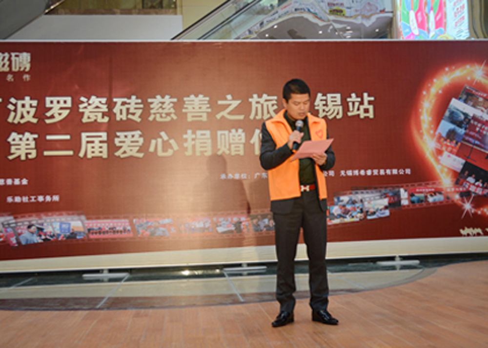 2014年3月15日馬可波羅瓷磚慈善之旅再一次來到無錫,捐贈儀式現場無錫馬可波羅同樣捐贈3萬元,為20位貧困的學子們獻上一份愛心。屆時無錫馬可波羅瓷磚總經理朱廷樹先生發表重要講話,表示會一直堅持做好每一份慈善事業,會一直帶領無錫馬可波羅瓷磚將愛進行到底,用無錫馬可波羅瓷磚的小愛換取大家的大愛,希望無錫馬可波羅的這次善舉可以吸引更多的人來關注我們的貧困學生,讓他們能夠健康快樂地成長;與此同時,無錫華廈家居港副總經理、財務總監、無錫華廈家居港愛心基金會會長杜慧增女士也發表了重要講話,杜總在講話中表示會一如既往支持無錫馬可波羅瓷磚的慈善之旅,她將會帶領她的團隊集體向無錫馬可波羅的家人們學習,會協助無錫馬可波羅波羅一起做好每一份善舉。