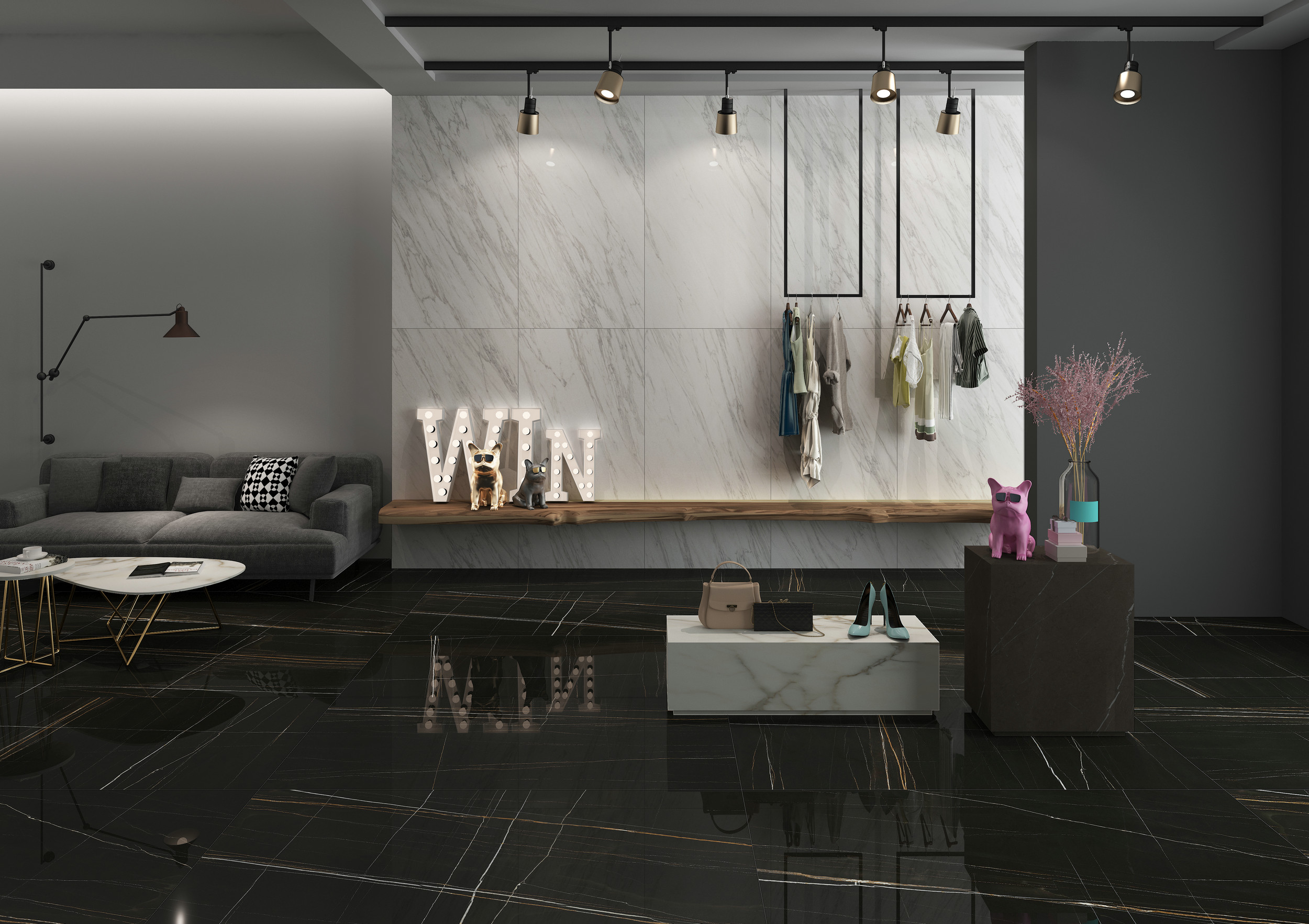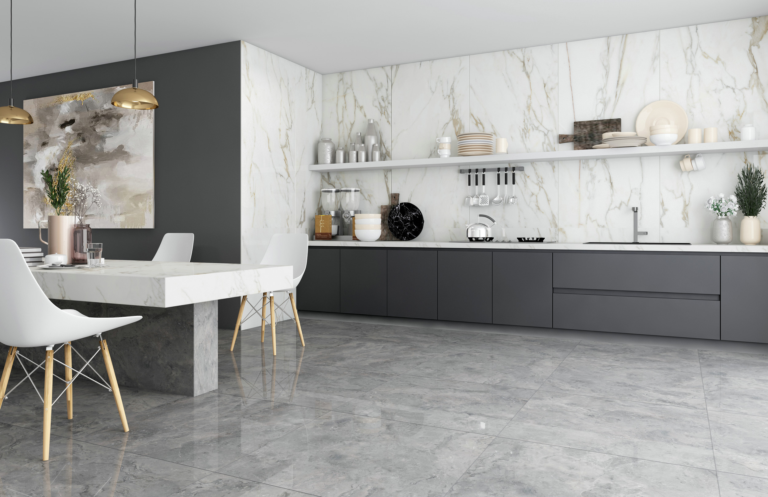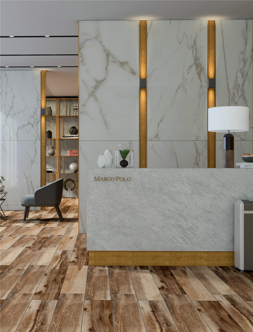 源自土耳其伊斯帕爾塔的天然石材君士坦丁灰,以獨特的色彩表現(xiàn)吸粉無數(shù),金色線條更是增加了時尚之感。