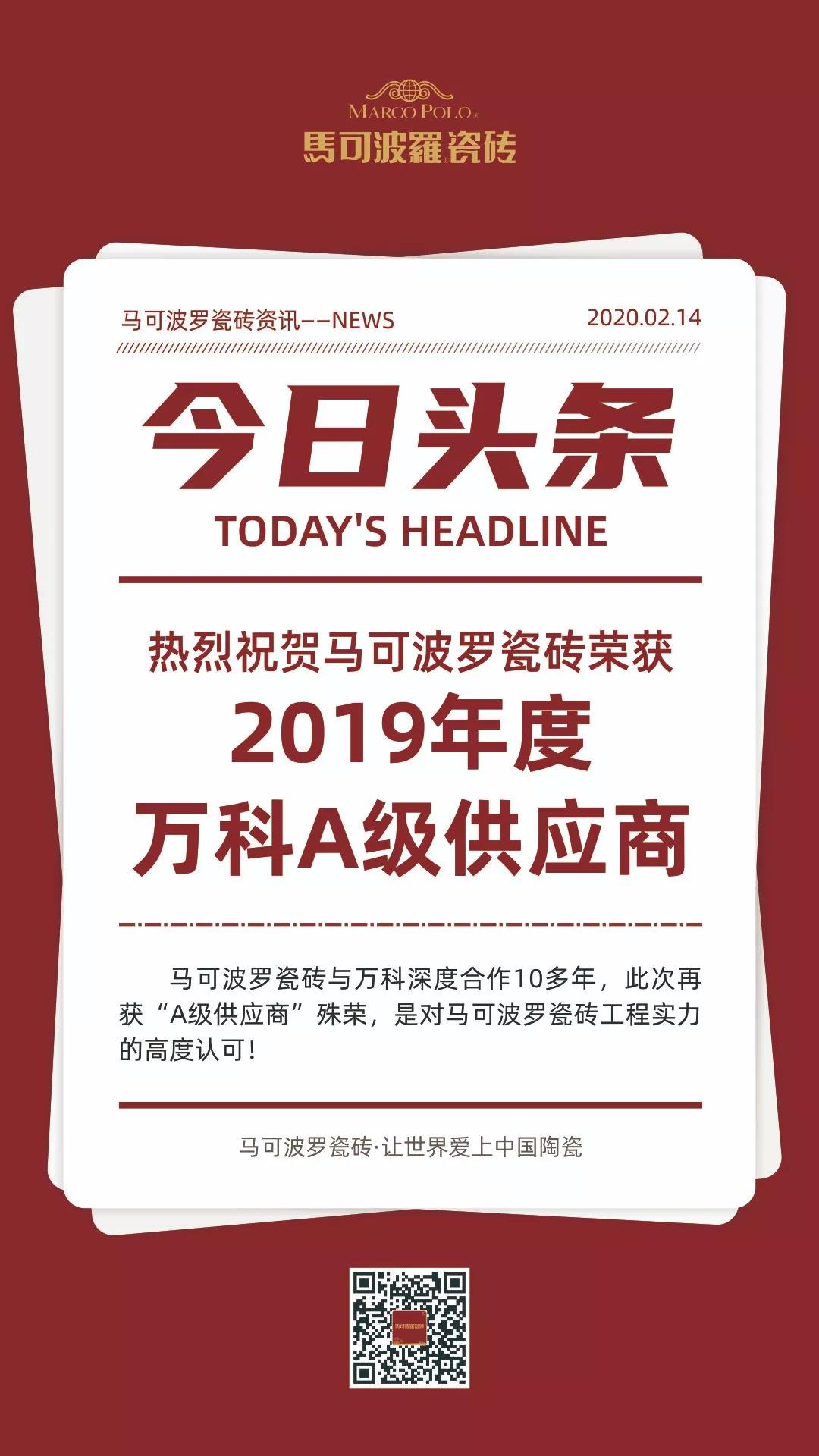 2月12日,萬科發布“2019年度合格供應商名錄”。馬可波羅瓷磚憑借卓越的工程實力,斬獲“2019年度萬科A級供應商”殊榮!