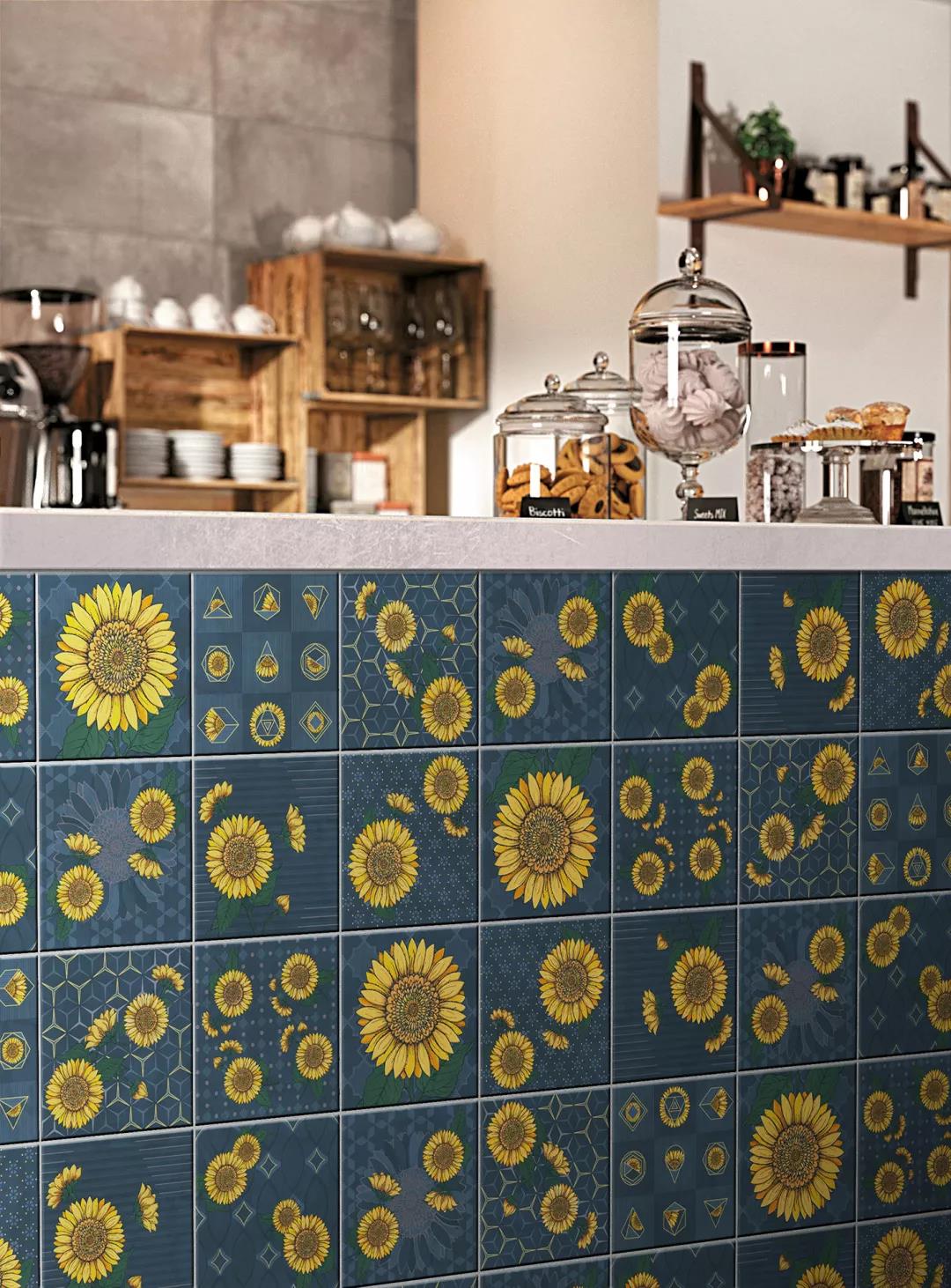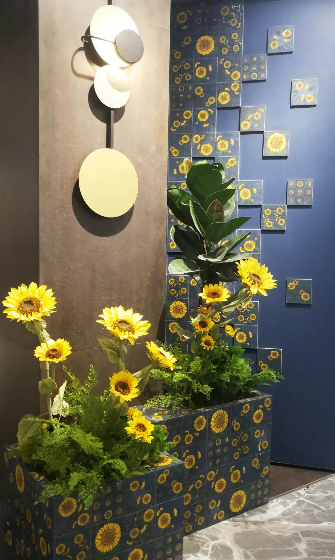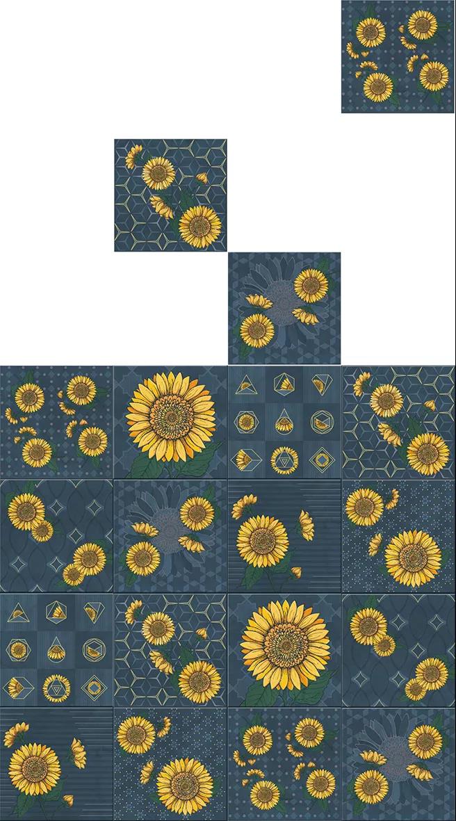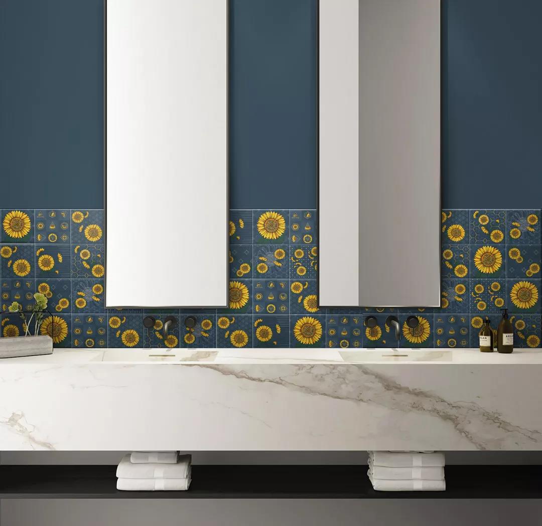 汲取梵高筆下炙熱陽光的生命張力,融入2020年國際五大主流色彩之一的古金黃,再結(jié)合2020年度流行色——經(jīng)典藍,詮釋蔚藍天空下如陽光般絢麗盛放的花朵,馬可波羅瓷磚以潮流色彩演繹經(jīng)典藝術(shù)元素,推出2020新品配件向日葵系列。