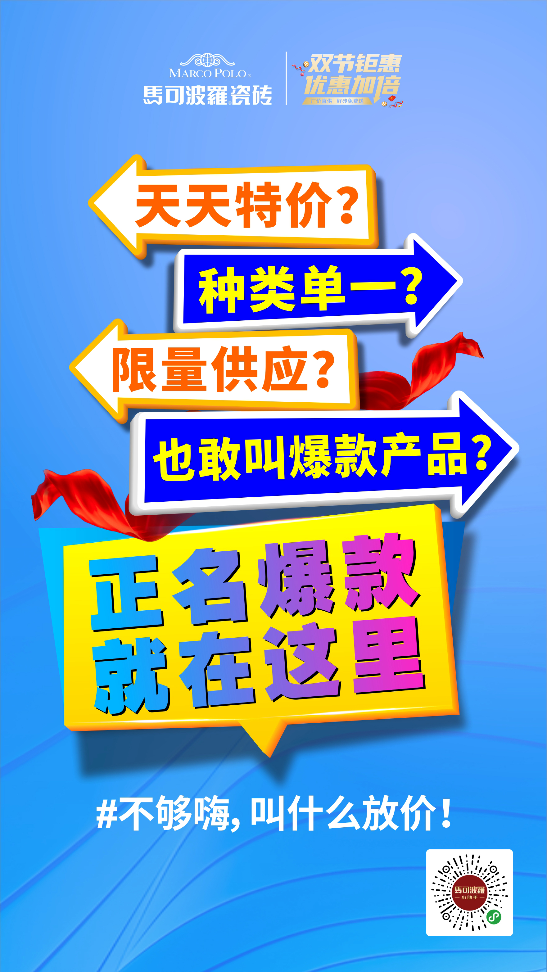 中秋國慶雙節將至,馬可波羅瓷磚告訴您什么才是真正的爆款產品。多規格、多花色,滿足不同空間需求;雙節特供價,全年僅此一次;不限量供應,讓您買得開心!