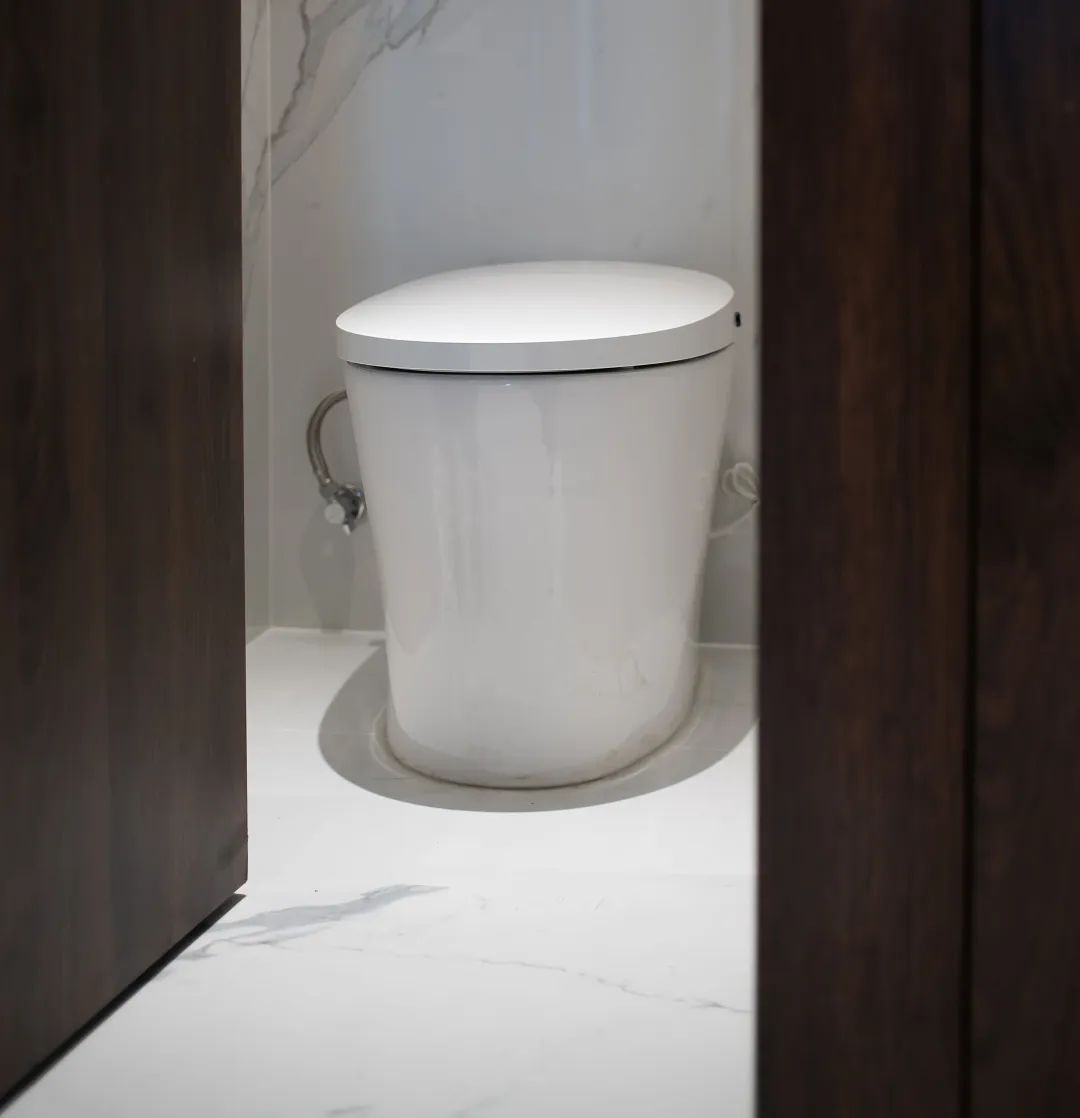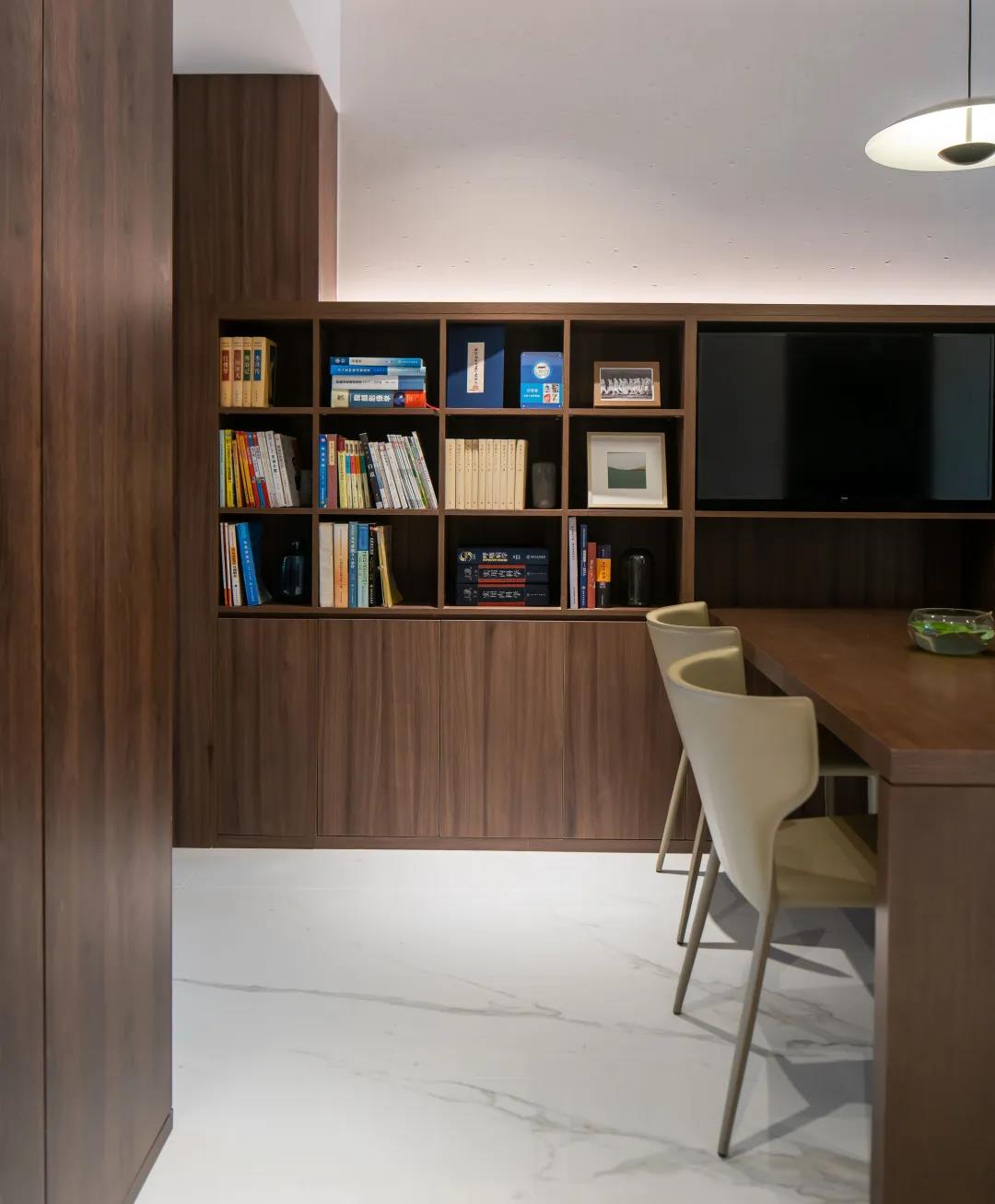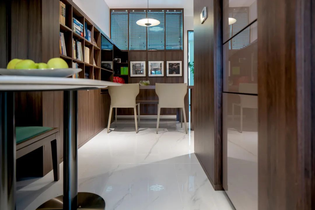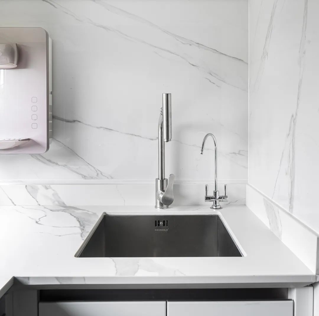 馬可波羅巖板經典魚肚白鋪地,搭配深色桌柜對比,更顯空間顯寬敞明亮,營造舒適氛圍。