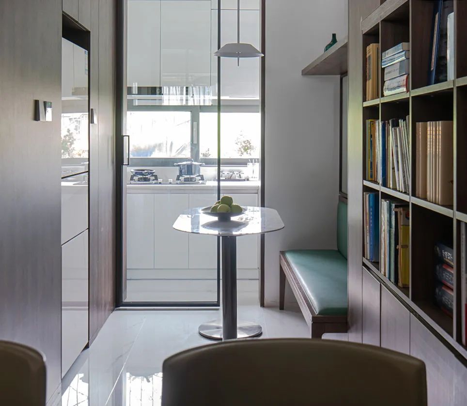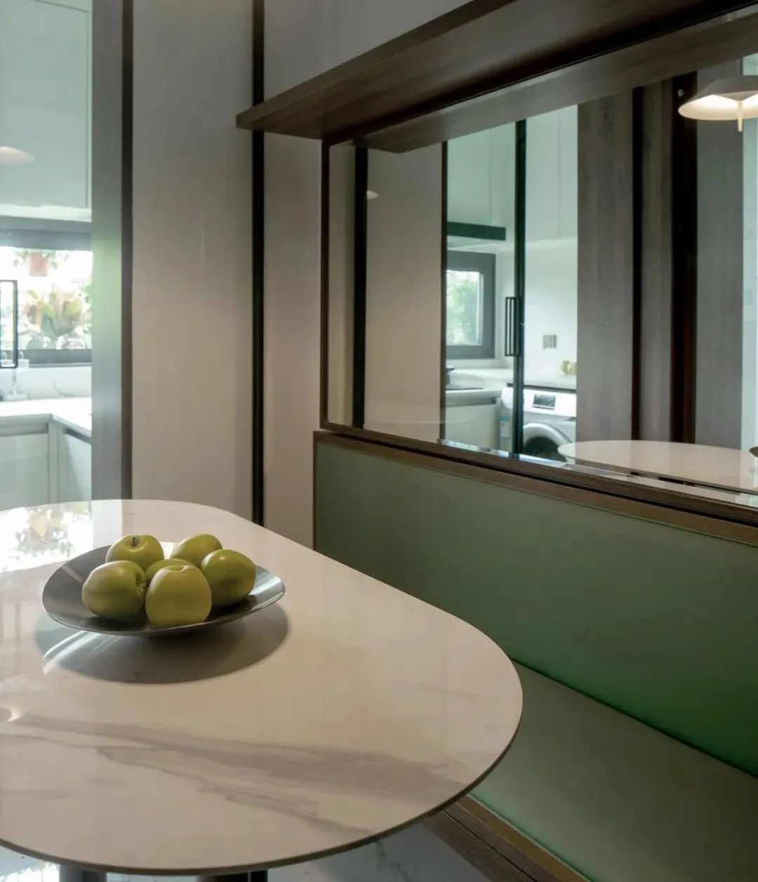 設計師為餐廳專門定制了一款超薄餐桌,使用馬可波羅巖板魚肚白加工成桌面。