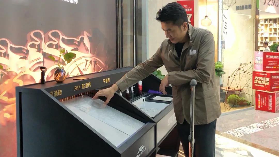 ▲ 設計師黃志達用拐杖實際體驗馬可波羅瓷磚出色防滑效果