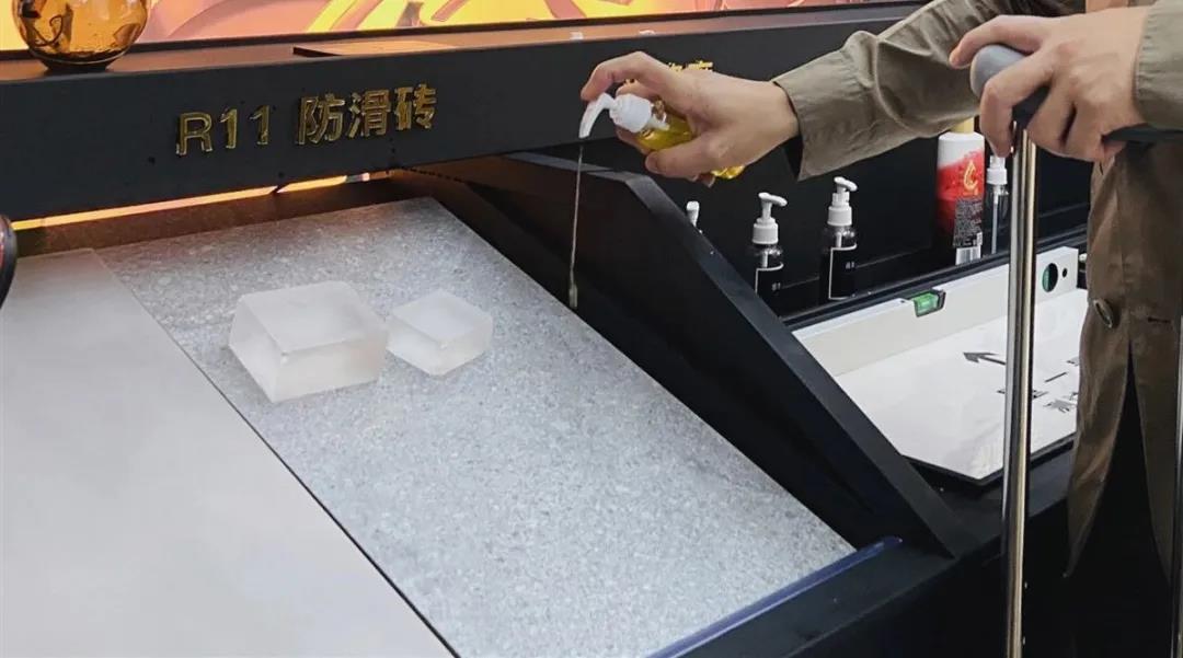 ▲ 通過水、油和沐浴露極端防滑測試,拐杖在馬可波羅瓷磚接觸面支撐堅實穩定