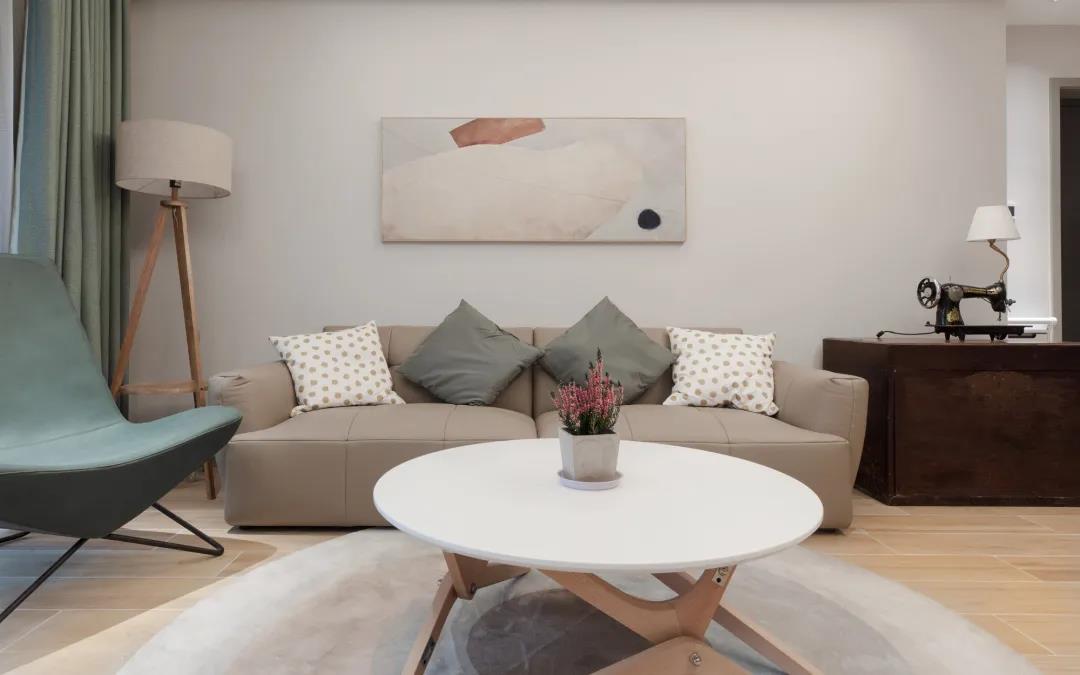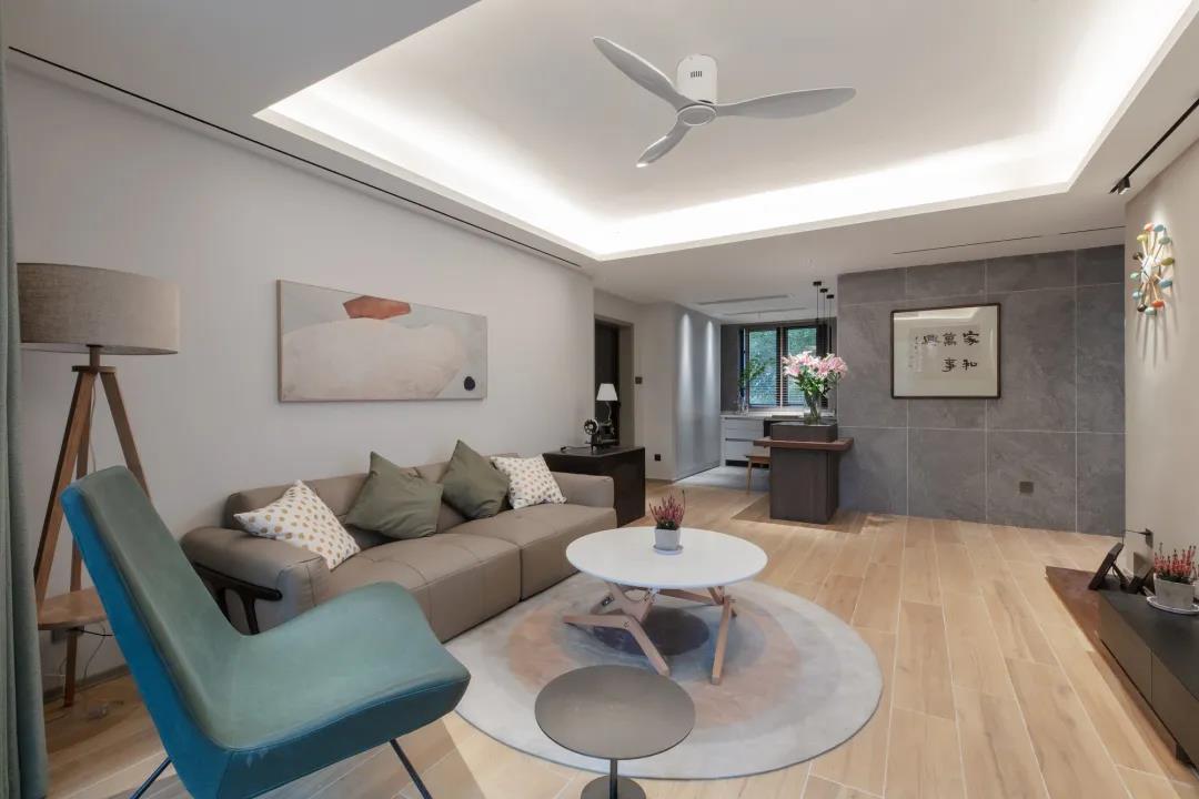 墻面鋪貼馬可波羅瓷磚米希爾,海浪般紋理,為客廳空間增添自然舒適氣息。
