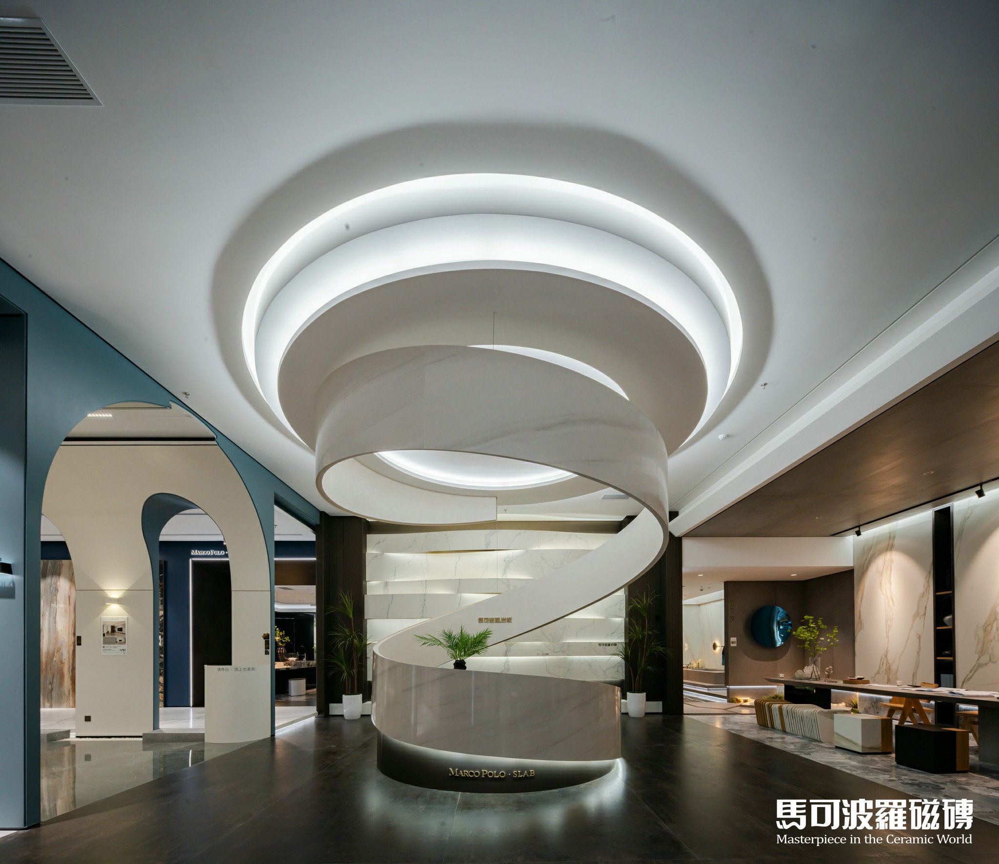 馬可波羅曲面巖板的問世更加拓寬了巖板的應(yīng)用空間,從地面、墻面、臺面、桌面、櫥柜、門、冰箱到圓形穹頂、回廊、弧形背景墻、圓包柱、別墅旋轉(zhuǎn)樓梯等幾乎所有家居空間,到切割加工茶臺、擺件等造型物品,以及建筑外墻等戶外領(lǐng)域中。馬可波羅巖板將美學(xué)與技術(shù)技能完美地結(jié)合在一起,使得巖板成為一款理想的萬能材料,可以運(yùn)用在家居空間、公共空間的任何場所,真正做到全屋巖板家居定制。