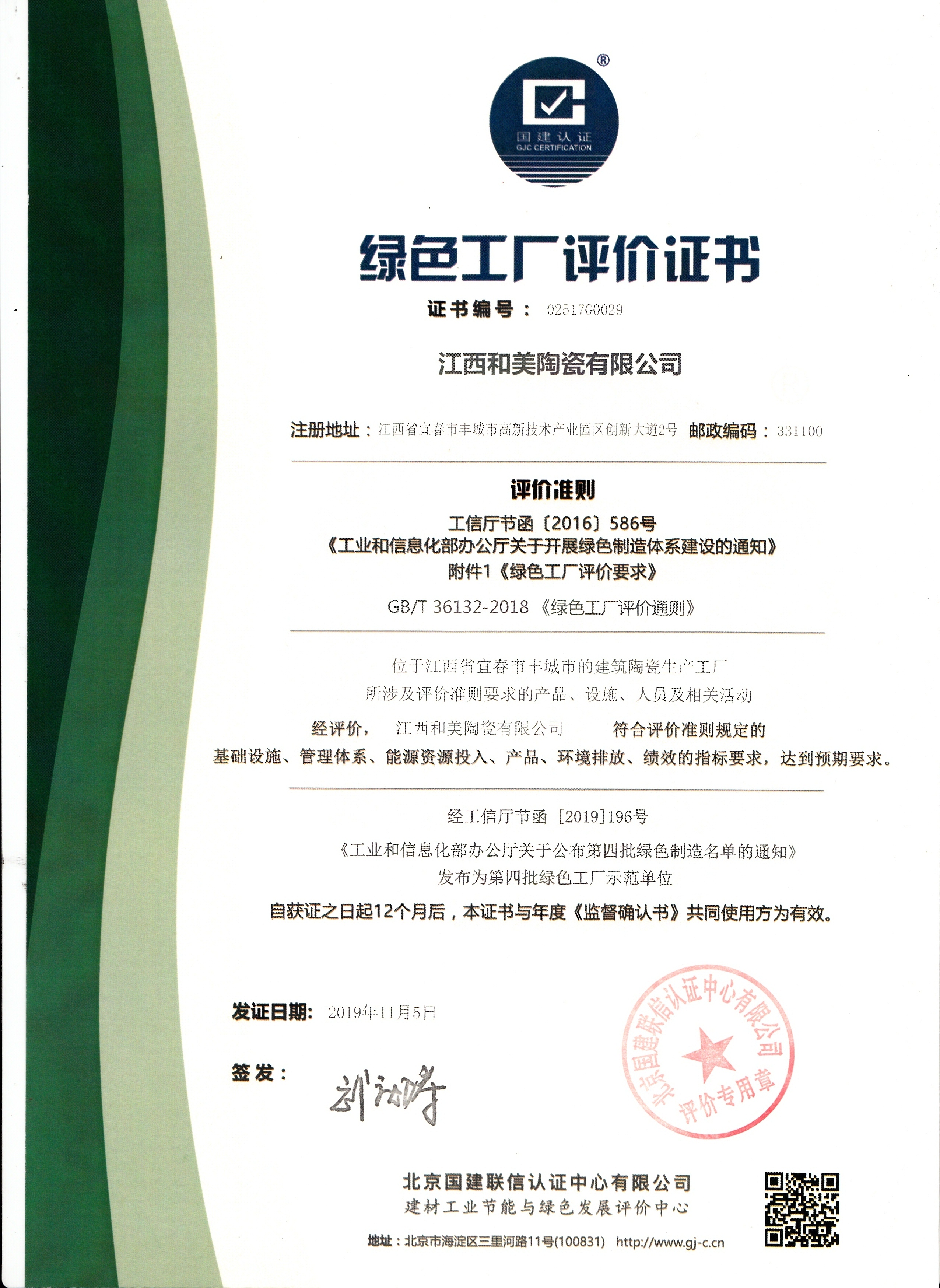國家級綠色工廠評價證書