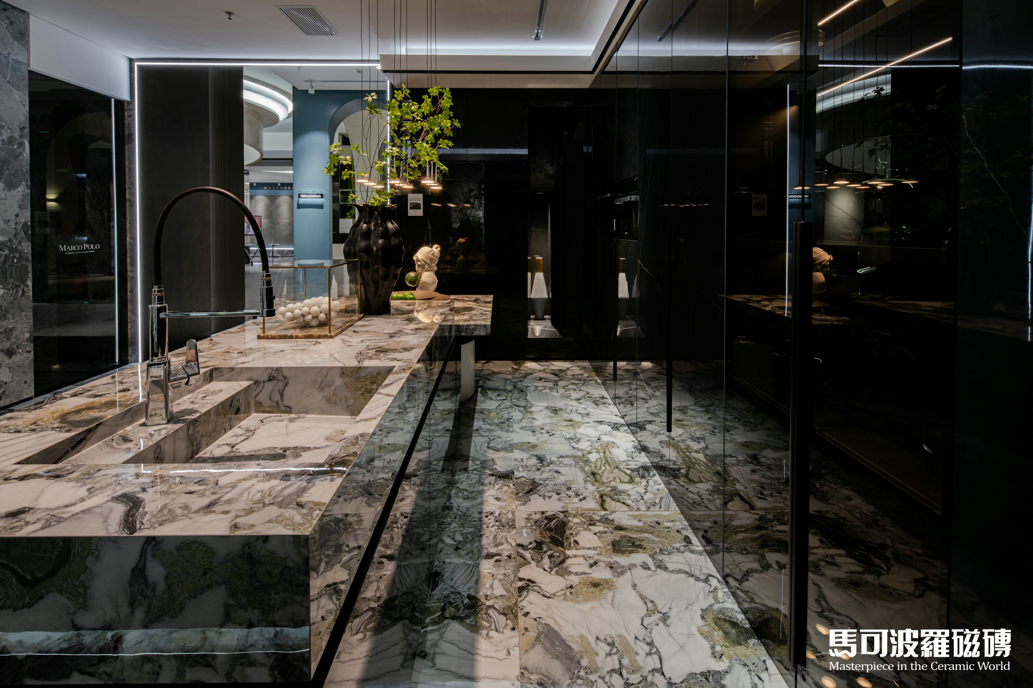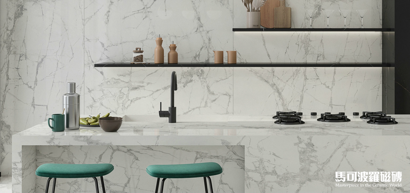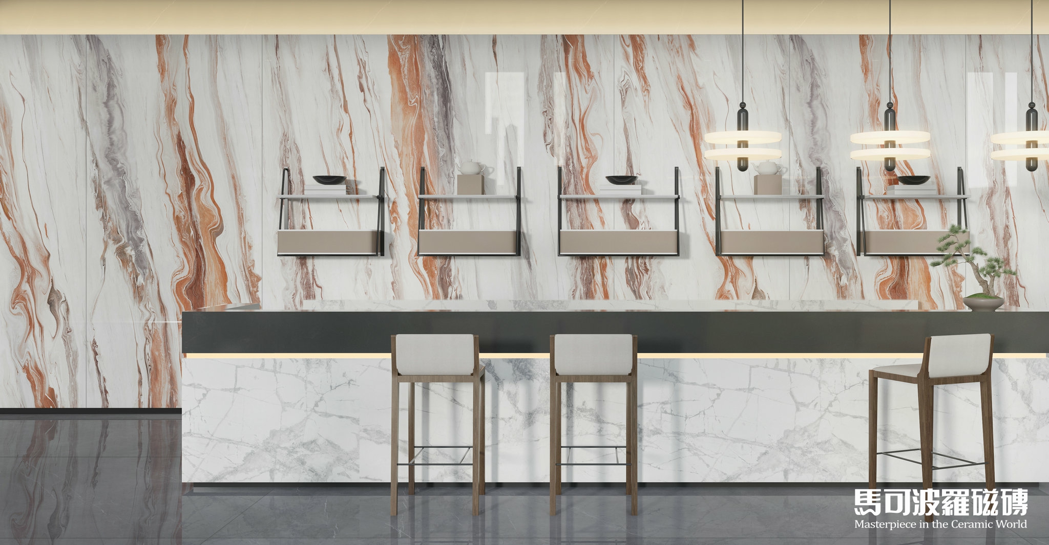 地面、墻面背景、桌面、凳子、甚至天花均為馬可波羅巖板