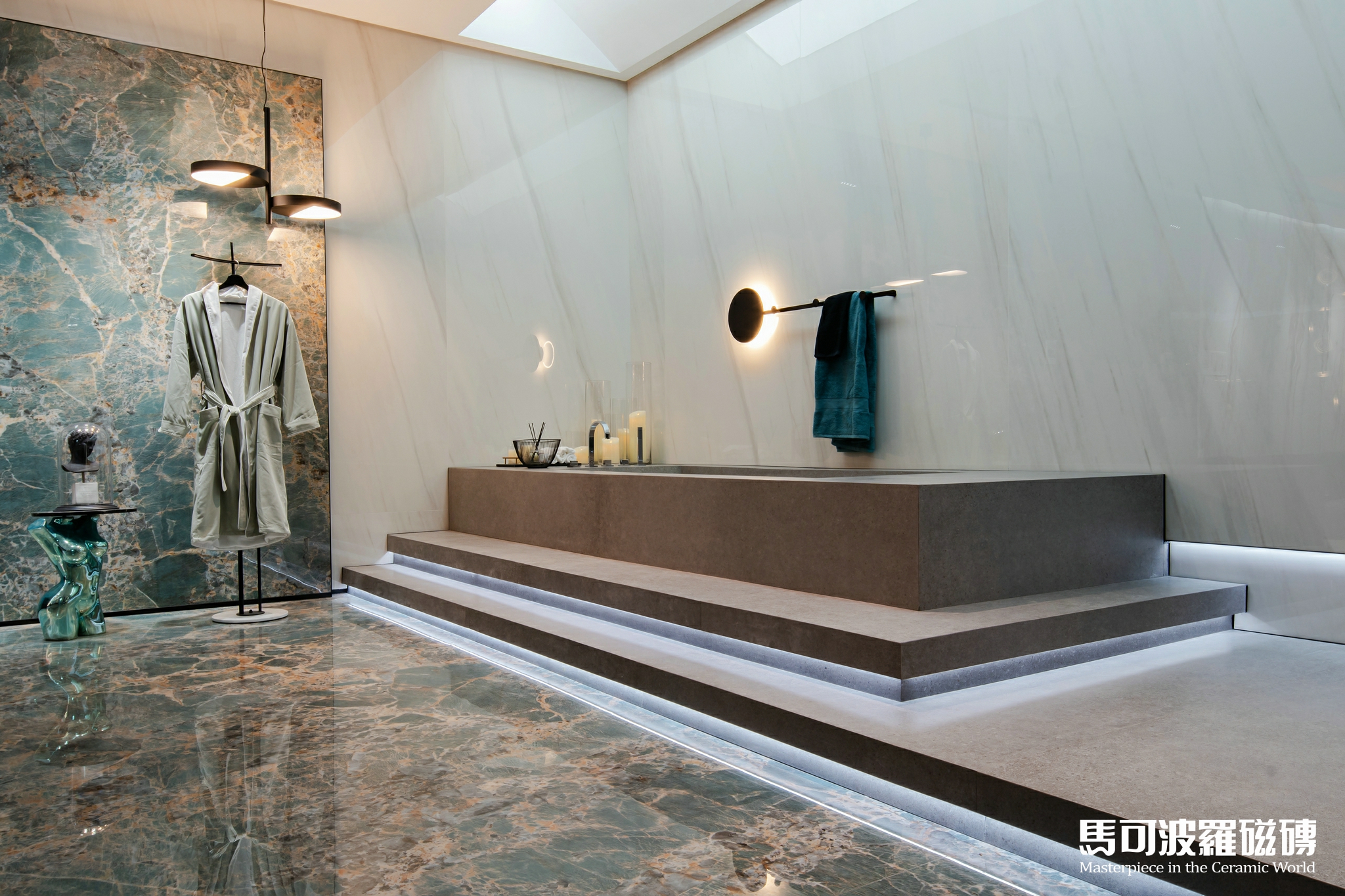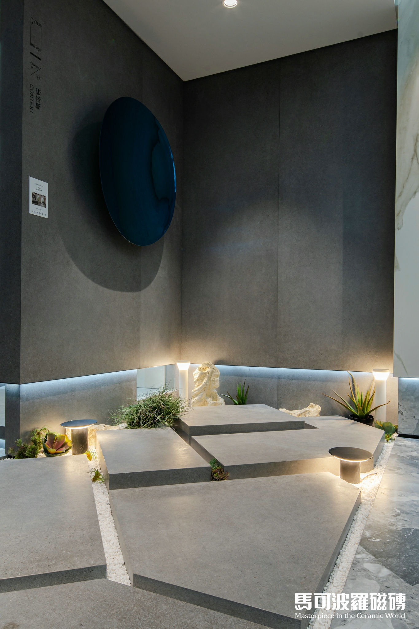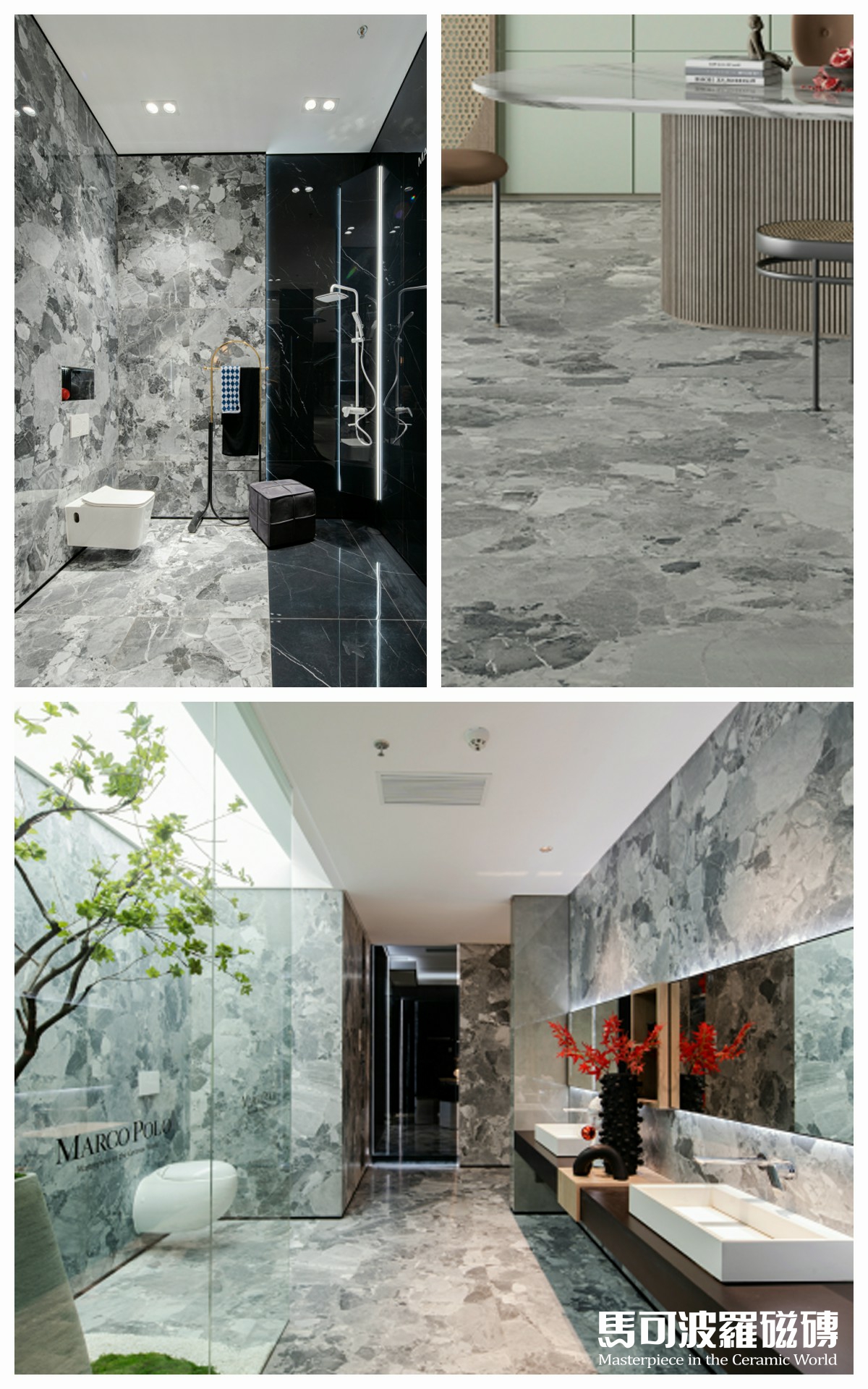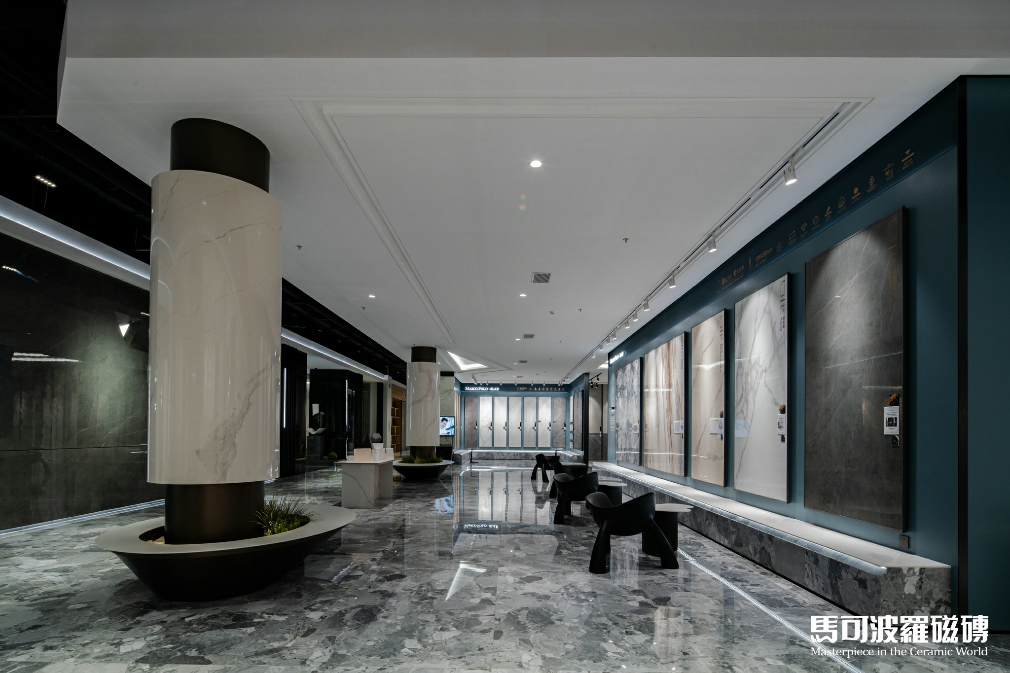 地面、墻面背景、桌面、凳子、甚至天花均為馬可波羅巖板