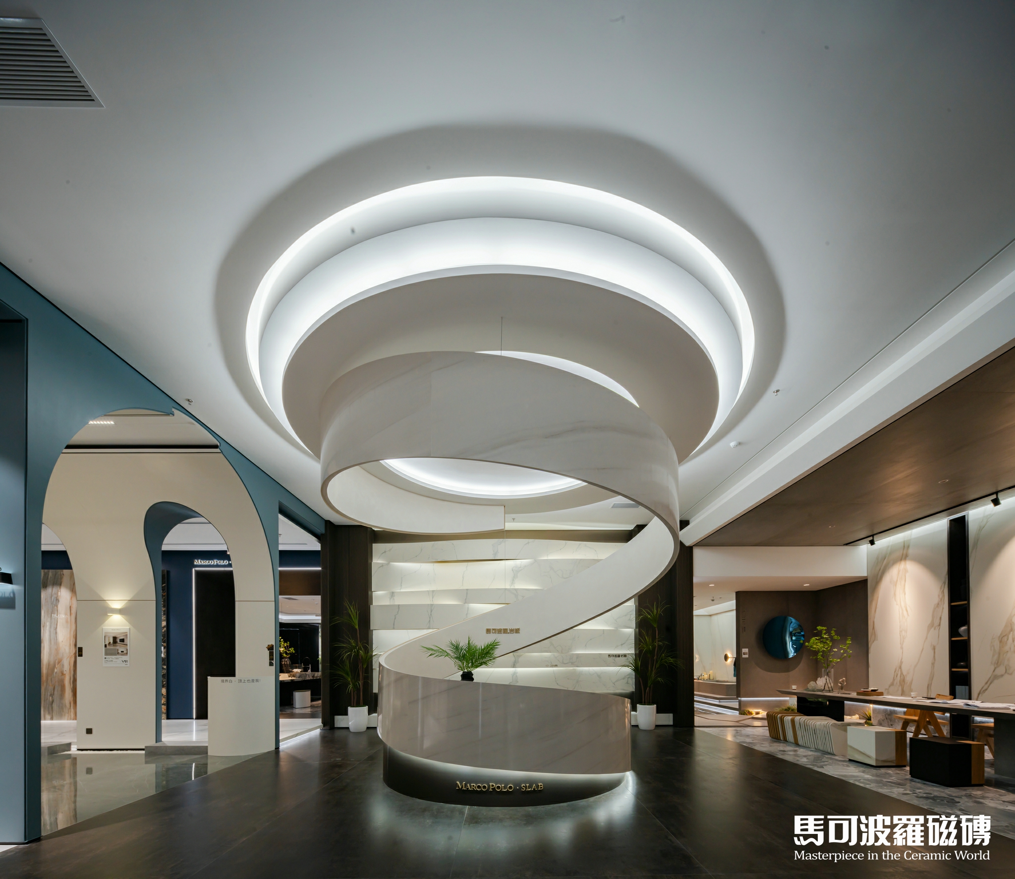 馬可波羅曲面巖板的問世更加拓寬了巖板的應用空間,從地面、墻面、臺面、桌面、櫥柜、門、冰箱到圓形穹頂、回廊、弧形背景墻、圓包柱、別墅旋轉樓梯等幾乎所有家居空間,及切割加工茶臺、擺件等造型物品,以及建筑外墻等戶外領域中。