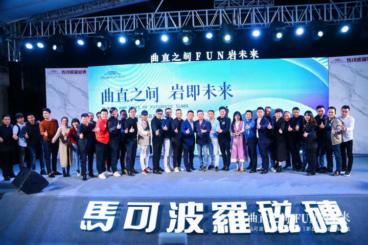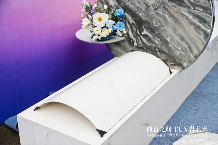 此次發(fā)布會舞臺的搭建采用了1600×3200mm規(guī)格的馬可波羅巖板,整體效果格外壯闊大氣。同時,現(xiàn)場還設置了馬可波羅巖板全域使用創(chuàng)意區(qū),將馬可波羅巖板的“曲直之美”展現(xiàn)得淋漓盡致。