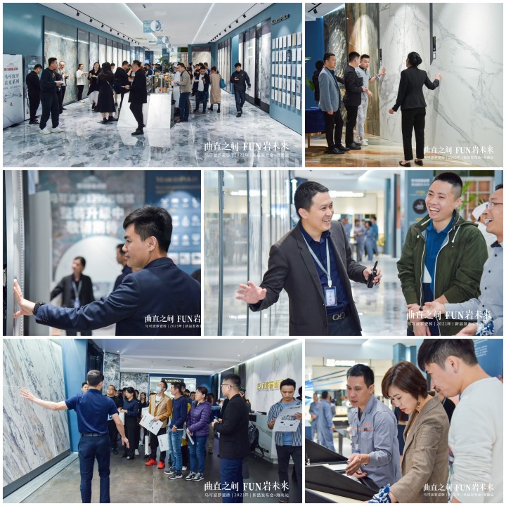 下午18時,各位領導嘉賓以及設計大咖在會場進行簽到后,一同參觀了海南馬可波羅瓷磚2021年新品展廳,直觀感受馬可波羅巖板的“曲直之美”,現(xiàn)場氣氛熱烈。