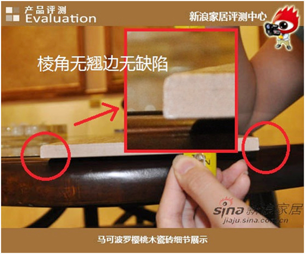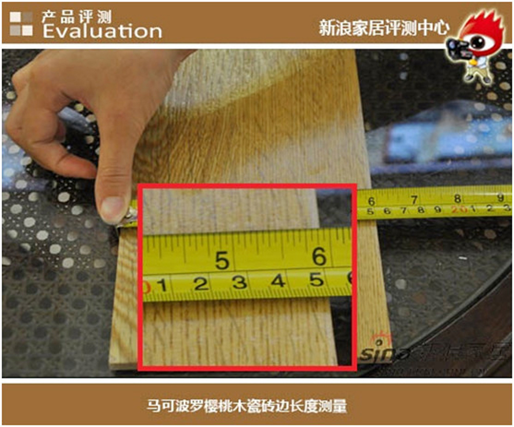 隨機取出一塊瓷磚,我們先觀察它的棱角,從瓷磚的邊角切割的地方,平整無裂縫,而且從側面的曲線看上去也呈筆直狀,沒有缺掉棱角和歪斜的缺陷。這說明瓷磚餓平直度是過關的。根據瓷磚國家標準,磚的長寬尺寸偏差不得超過±0.5%,通過小編實測,馬可波羅櫻桃木瓷磚長寬600*150mm,尺寸非常標準。