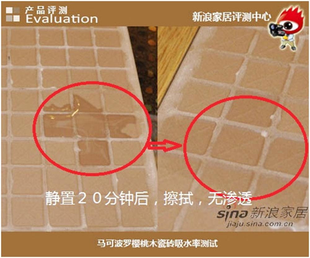 小編為了嚴格測試此款櫻桃木瓷磚的防水性,故意將水靜置在瓷磚的時間增加到20分鐘,。過了20分鐘后,水仍靜置在上面,用紙巾擦拭也很少看到有水分往里滲透的跡象。由此可以判斷這款瓷磚的密度高,滲水率低。