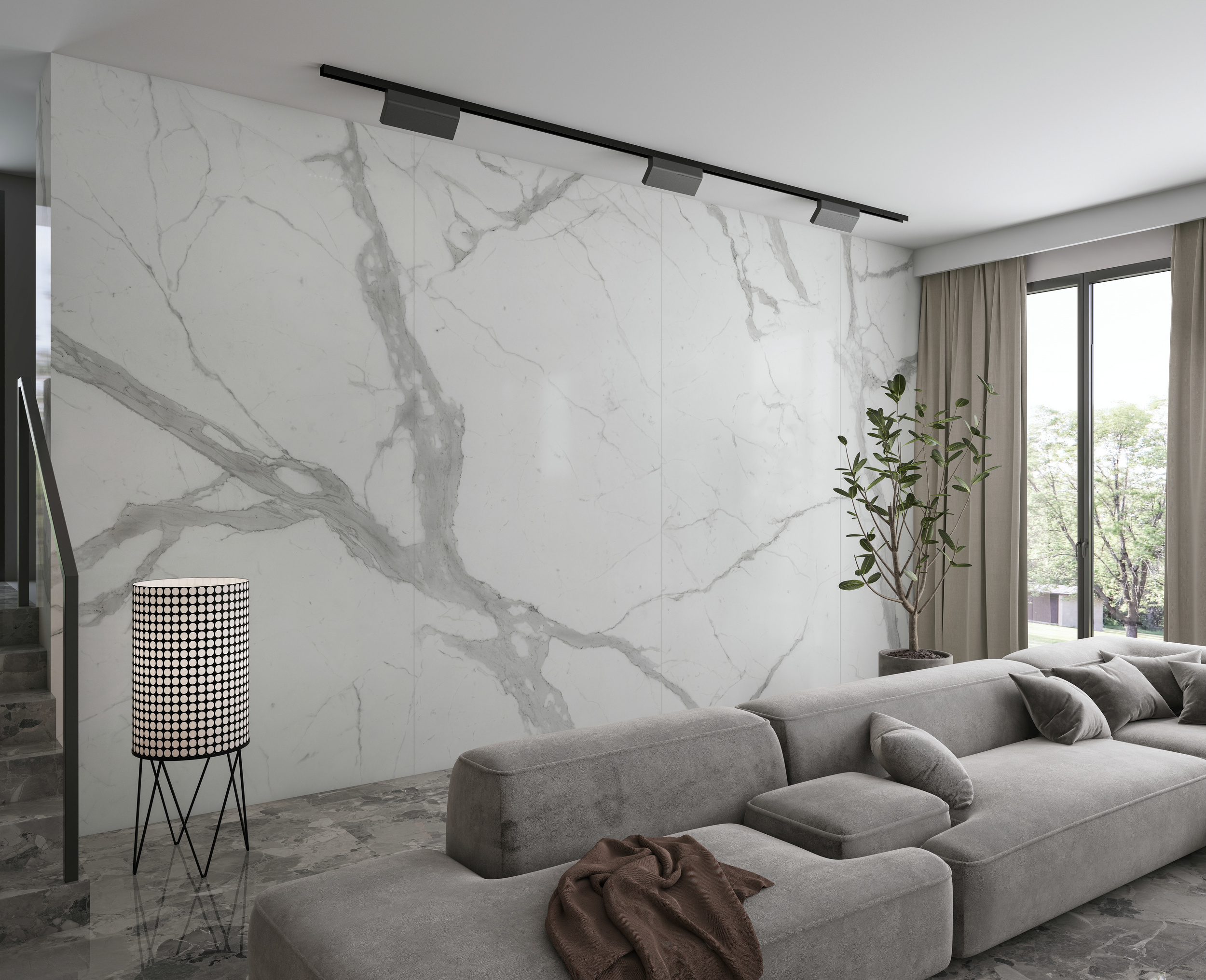 馬可波羅巖板黃金卡拉卡塔底色潔白細膩,具有流動感的紋理給空間帶來一種空靈潔凈的氣息。