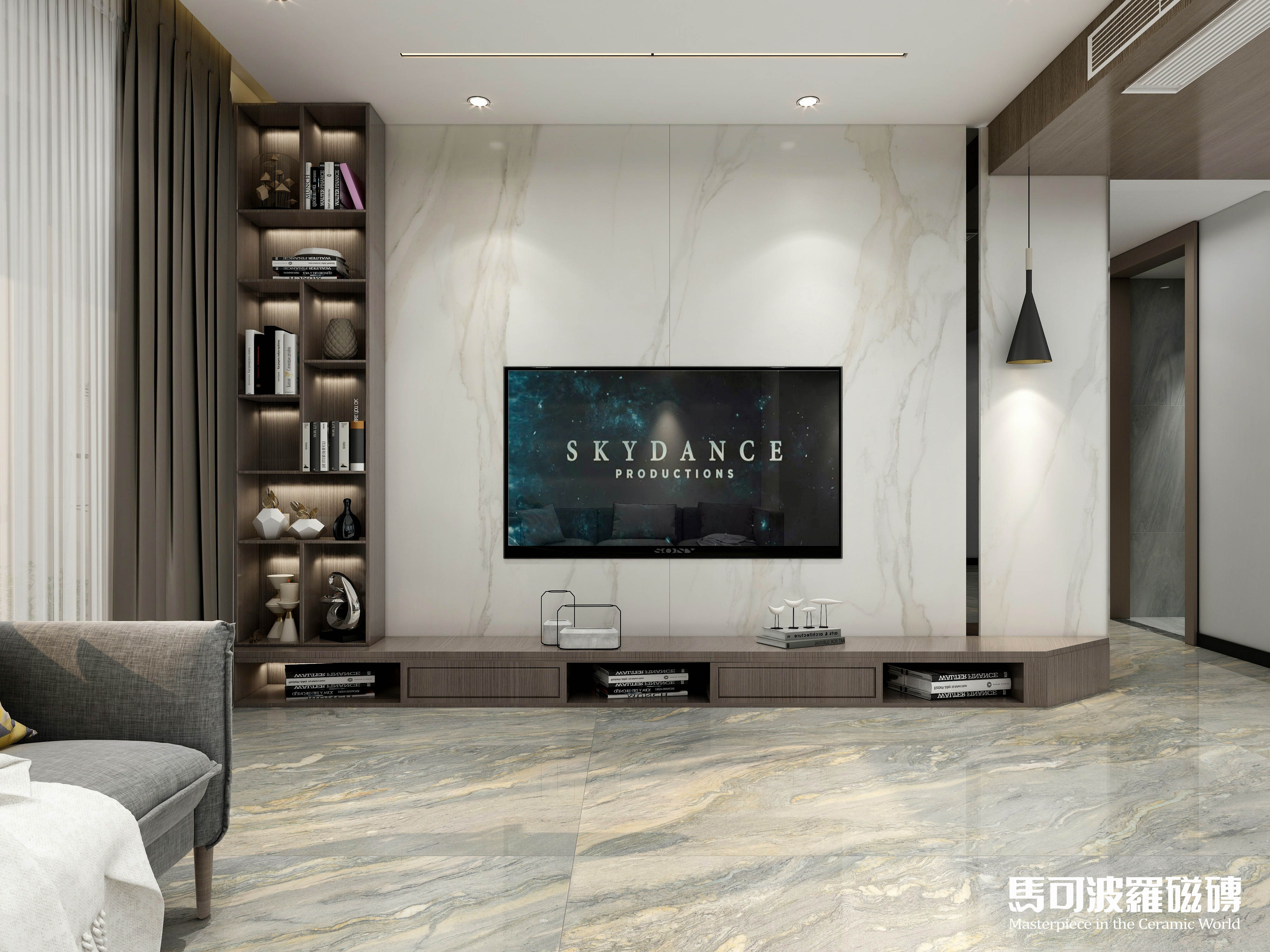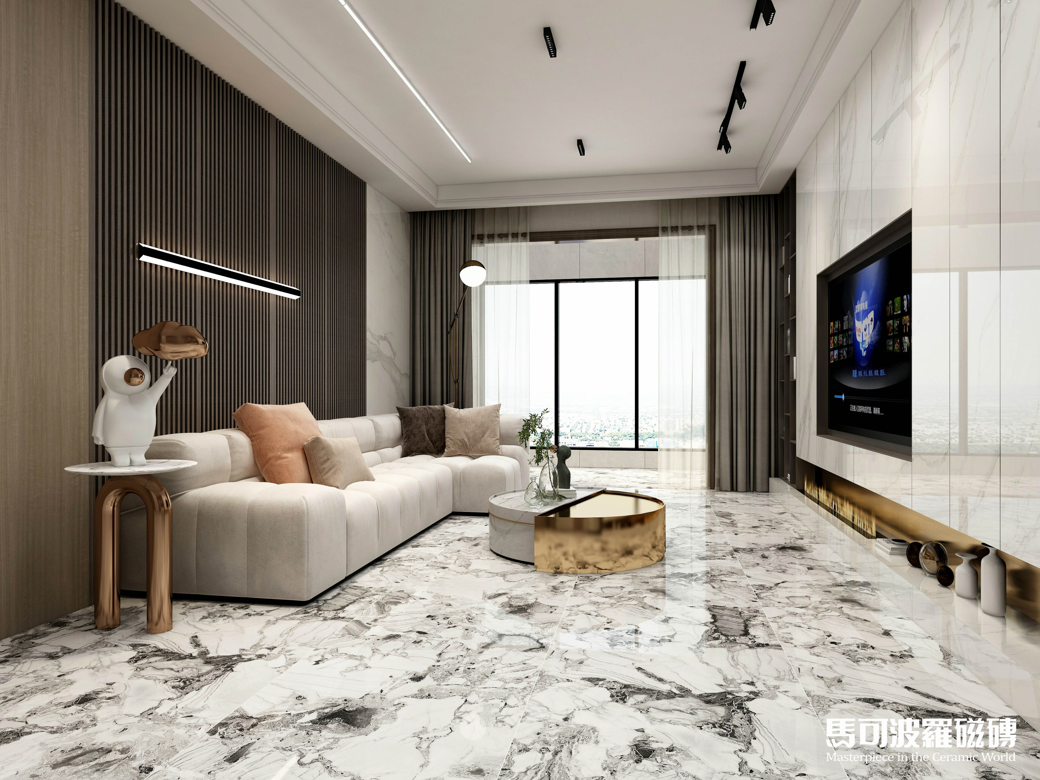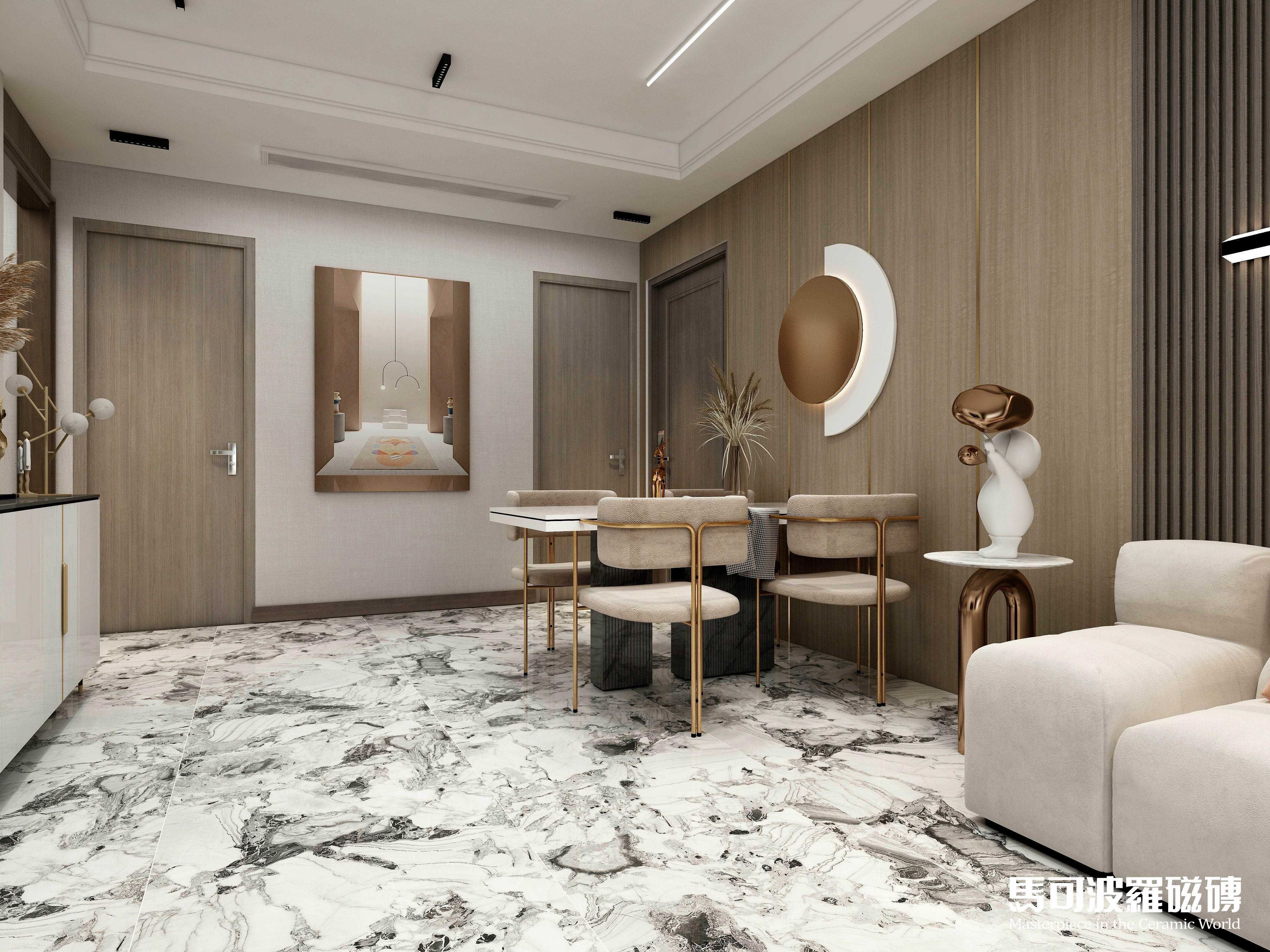 地面采用馬可波羅瓷磚冷翡翠,翡翠紋理經過黑白化處理,質感大氣典雅,更給人舒適自然的體驗。簡約流暢的沙發線條搭配茶幾、邊幾的金屬質感,在縷縷燈光映照下,更顯輕奢時尚,為空間渲染上了兼具尊貴與雅致的別樣美感。