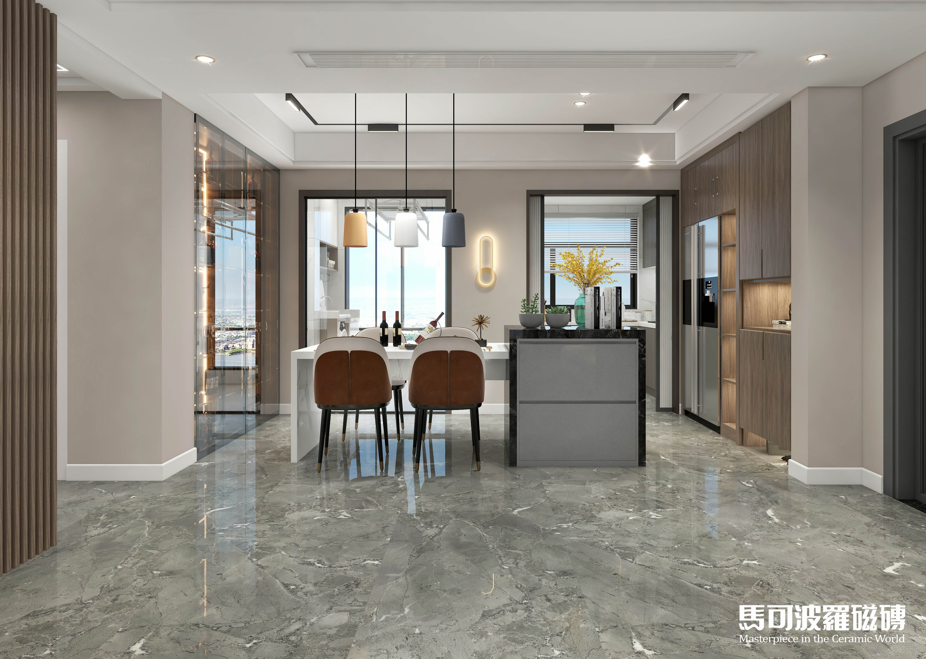 空間以灰白色為主色調,地面采用馬可波羅瓷磚藍金多瑙河,夢幻般的藍金配色,紋理如潺潺流水,靈動自然。搭配天花、柜體的深木色元素,整個空間都洋溢著溫暖寧和的居家氛圍。