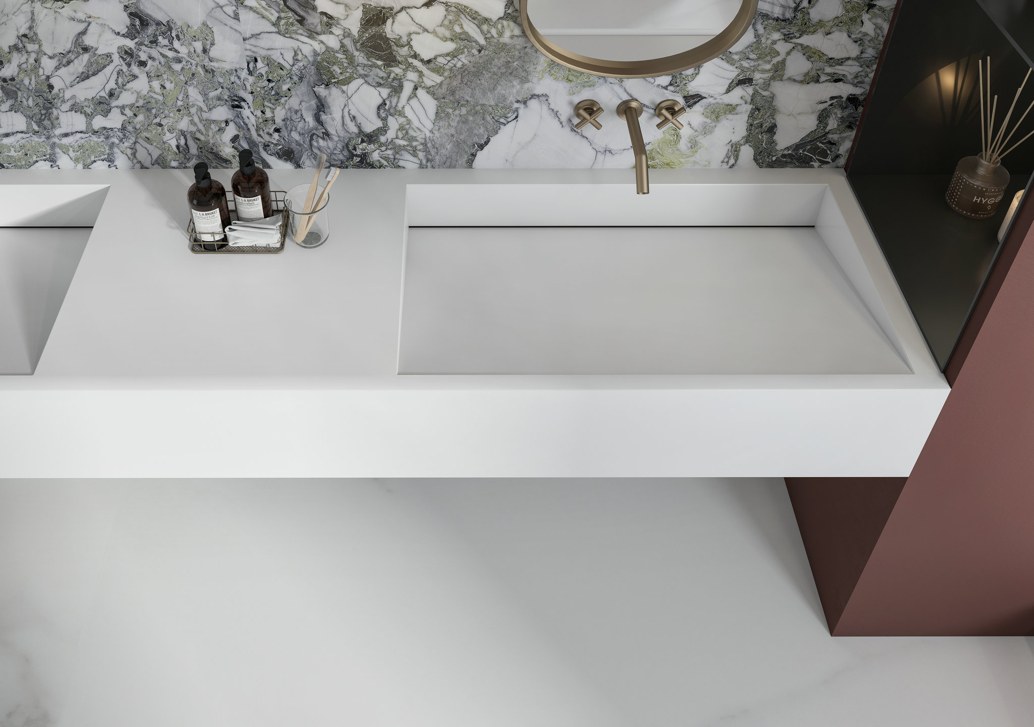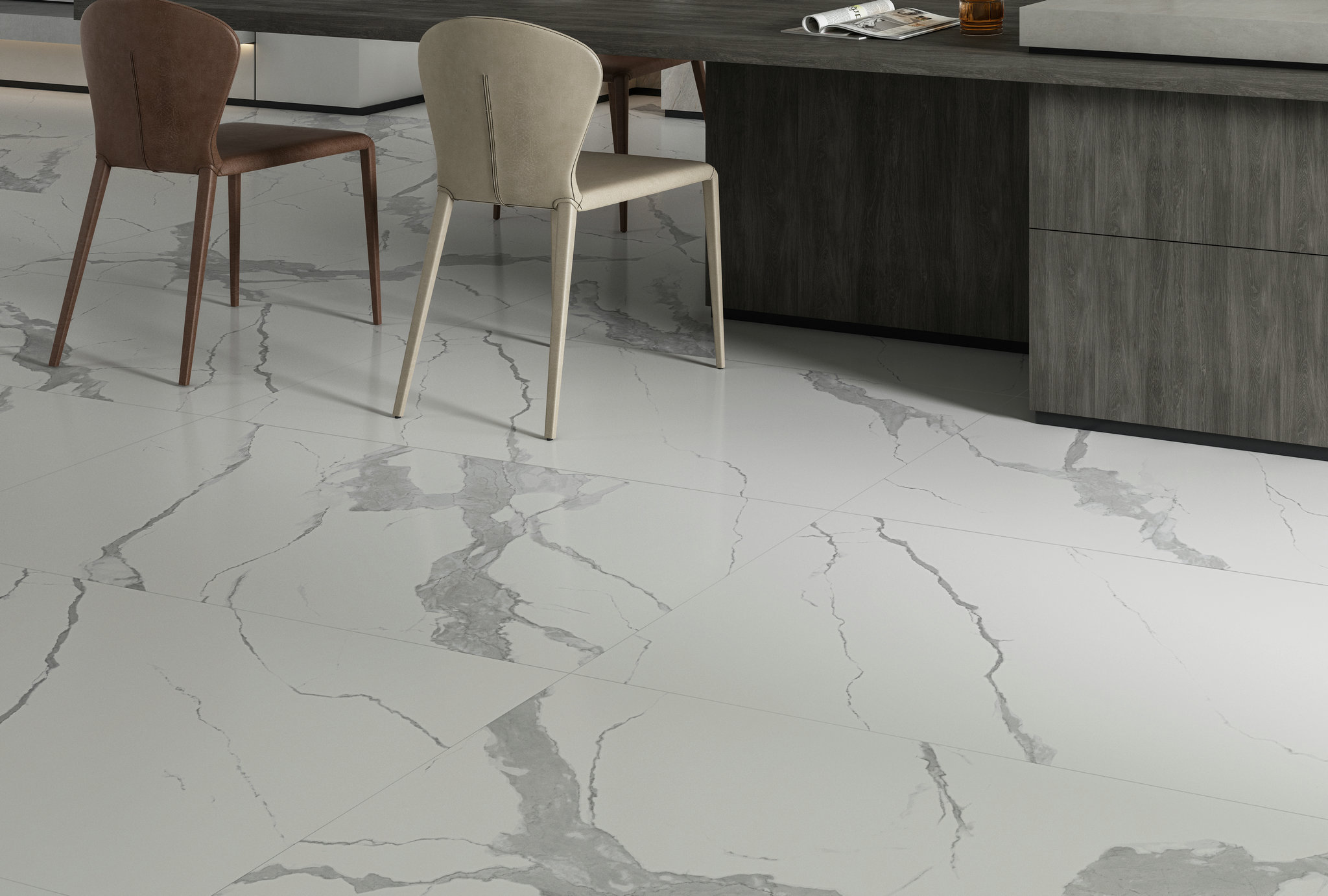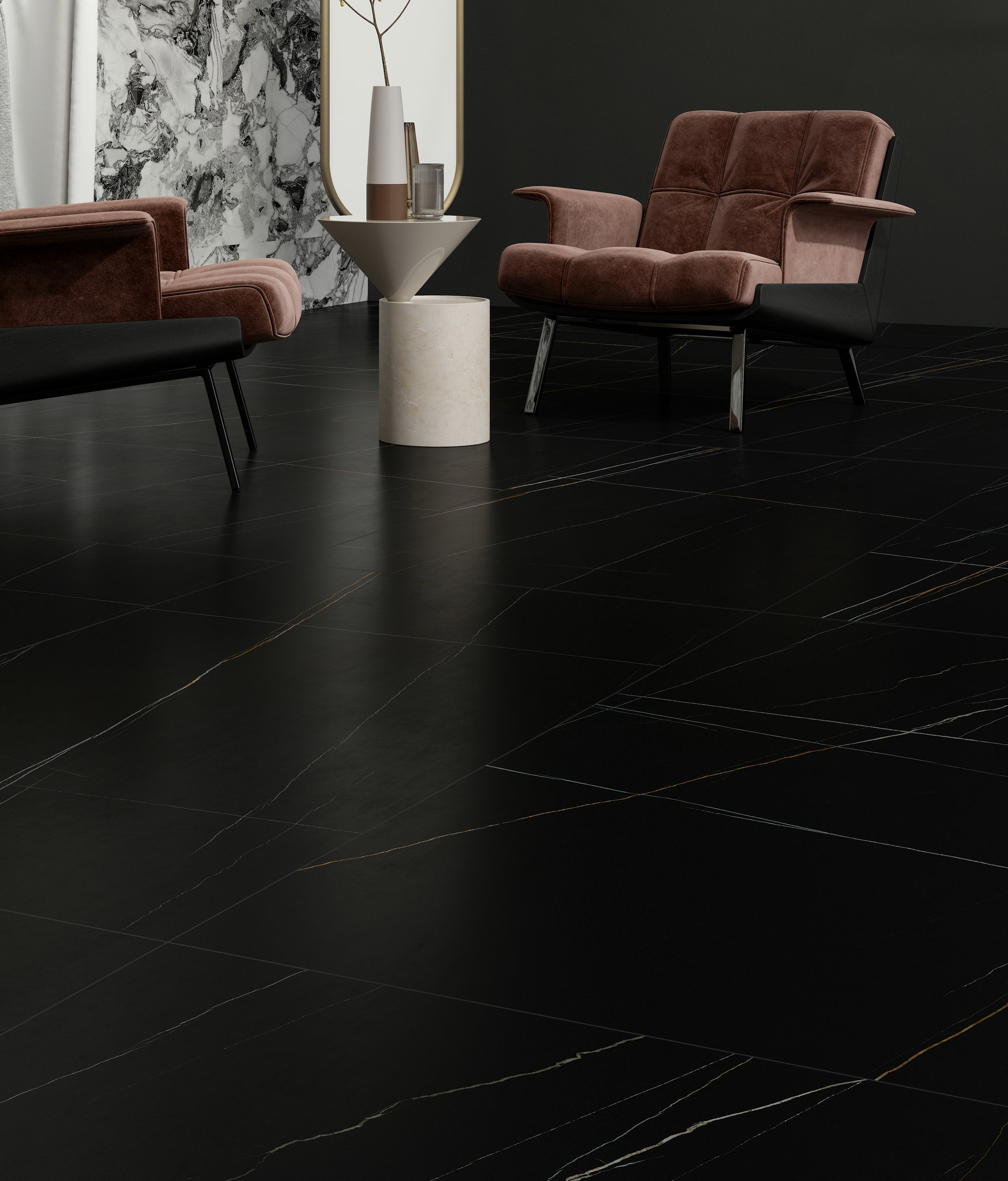 搭配亮面產品一起裝飾,亮光上墻、柔光鋪地,保證材質統一性且增加空間的層次感,打造質感空間。