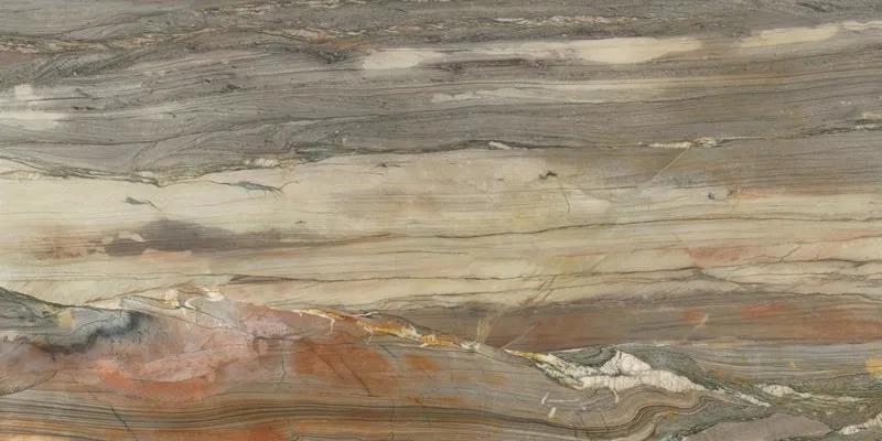 馬可波羅巖板虹木石玉,將歲月的長河在石化木的表面留下豐富的花色紋理呈現。