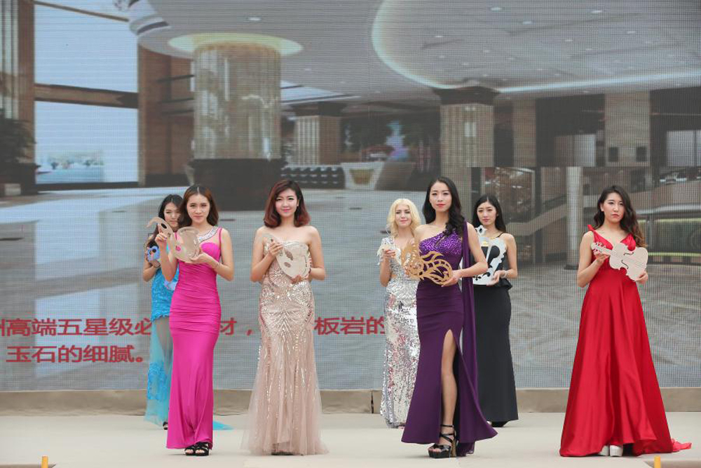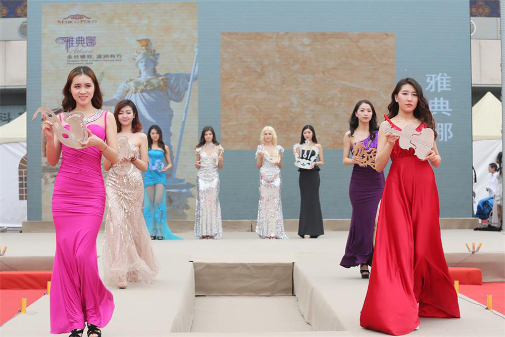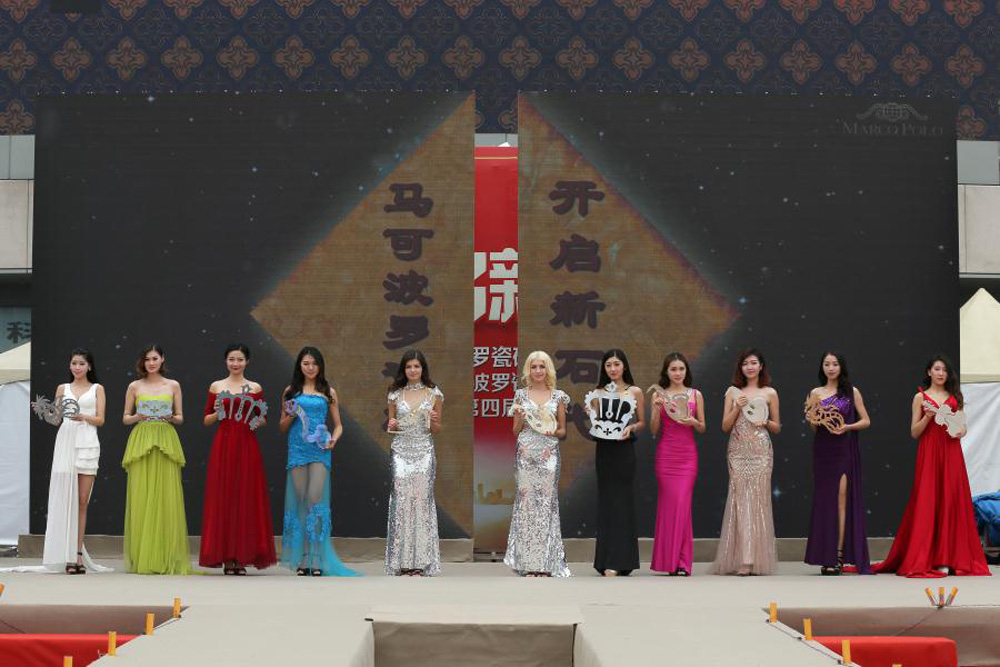 一部融匯馬可波羅瓷磚品牌文化歷程及新品研發過程的宣傳片,將在場所有觀眾都帶回充滿意大利淵源的文化中,馬可波羅瓷磚勇于開拓不斷創新的精神深深感染著在場所有嘉賓。隨后,12名身著高貴艷麗禮服的模特,用走秀的方式向觀眾展示了“曼哈頓”、“馬德里”、“凱悅石”、“狄安娜”“雅典娜”等新品。配合著音樂和主持人的背景解說,她們手中展示了形狀各異,創意獨特的產品。