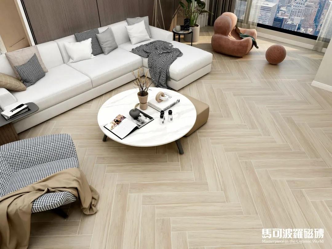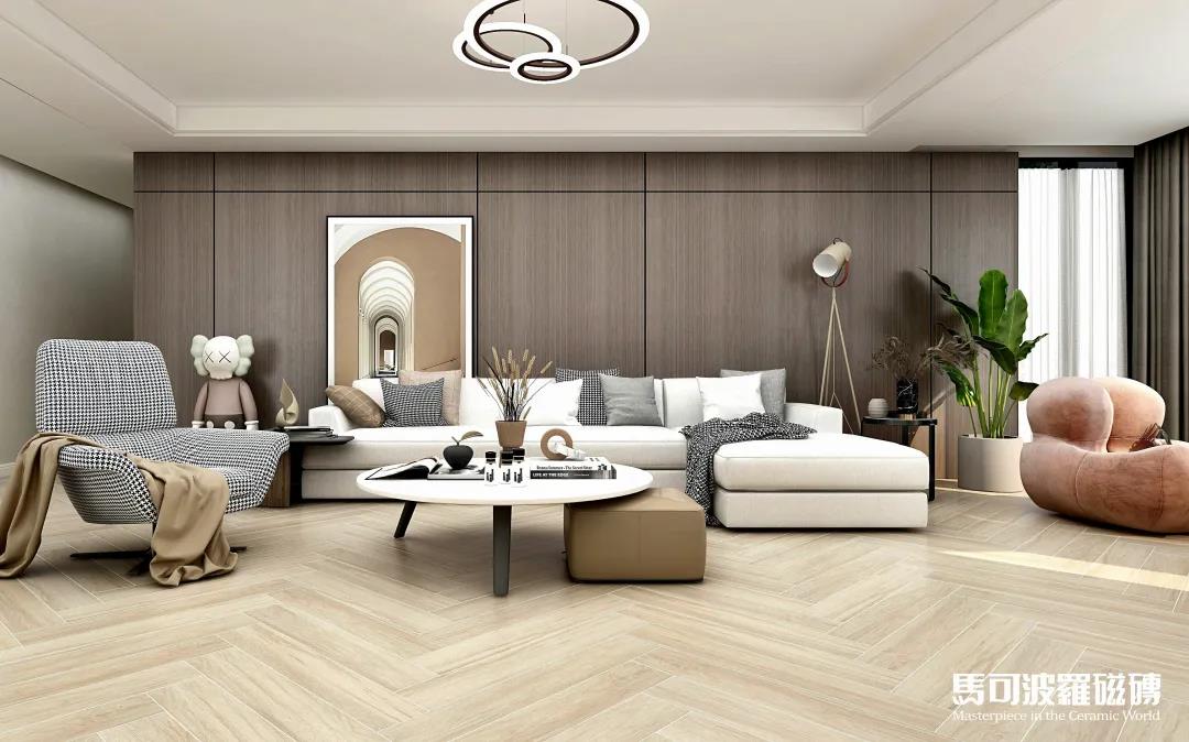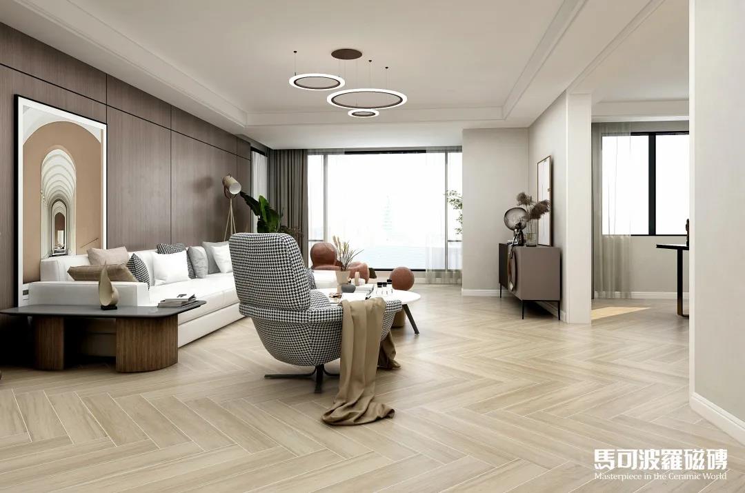 地面的淺杏色木紋磚賽州檀木采用人字形鋪貼式,時尚兼具層次感,搭配簡約規整的淺色家居布置,陽光透過落地窗照射進來,一派清新怡然。