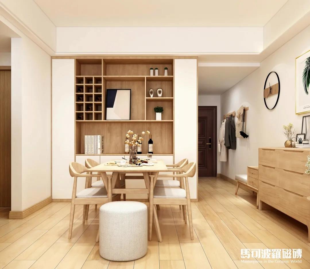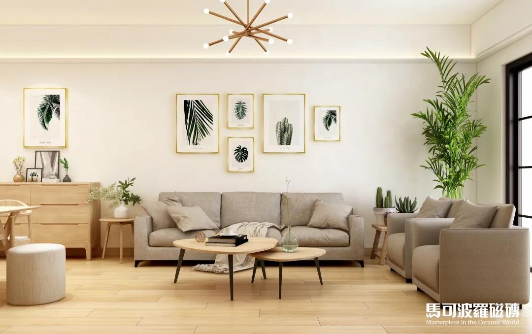 馬可波羅木紋磚芬蘭赤松,獨具北歐風情的柔和色調,搭配木色與淺灰色家裝,加之綠植和掛畫點綴,清新又不失精致品味。
