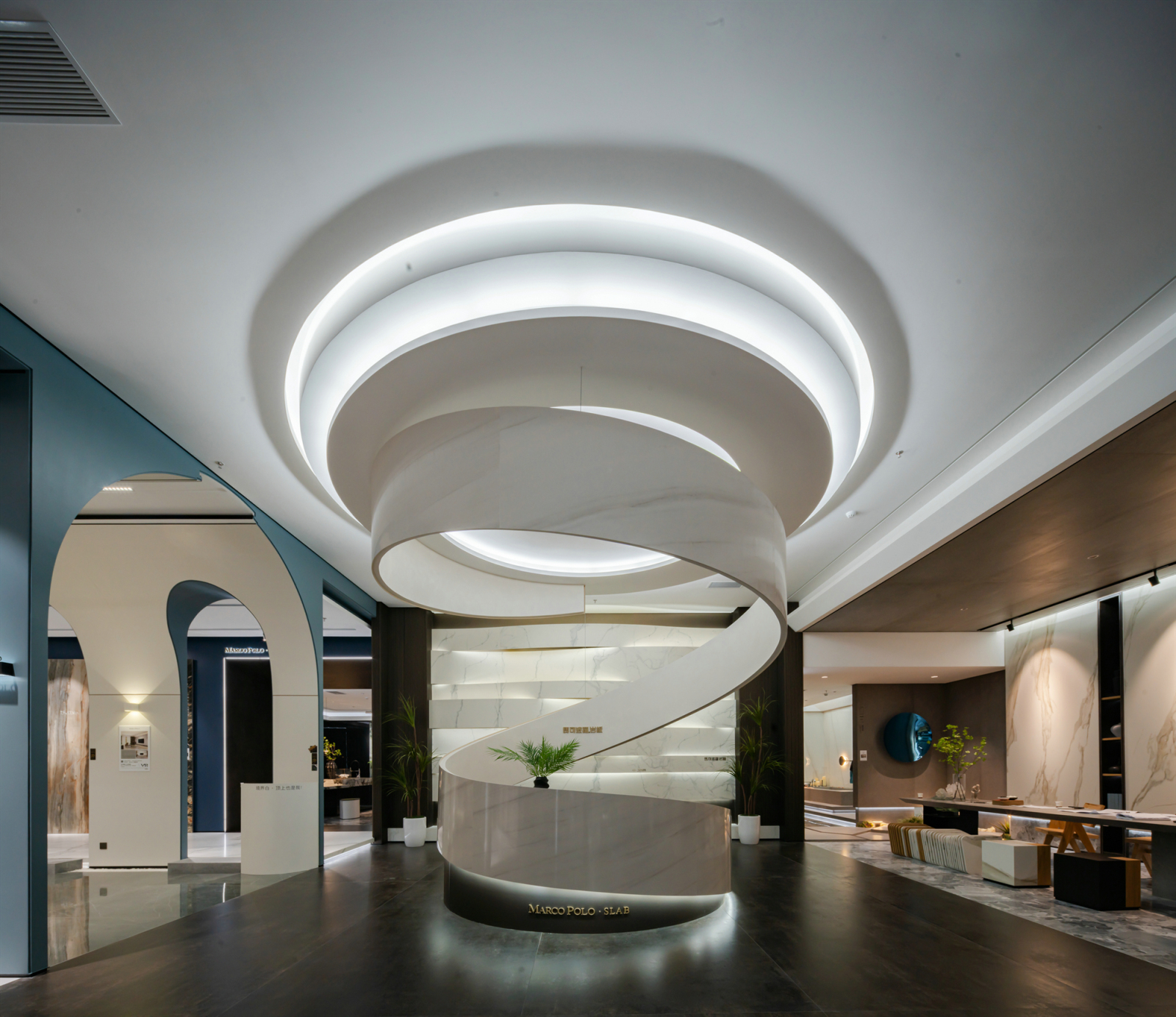 其中,馬可波羅自主研發曲面巖板,可實現6mm厚高彎曲度弧形板的極限可能,最大彎曲弧度達120°,進一步拓寬巖板的應用空間,涵蓋圓形穹頂、回廊、弧形背景墻、圓包柱、別墅旋轉樓梯等幾乎所有家居領域,真正做到全屋巖板家居定制。