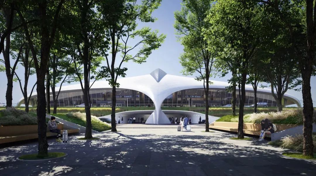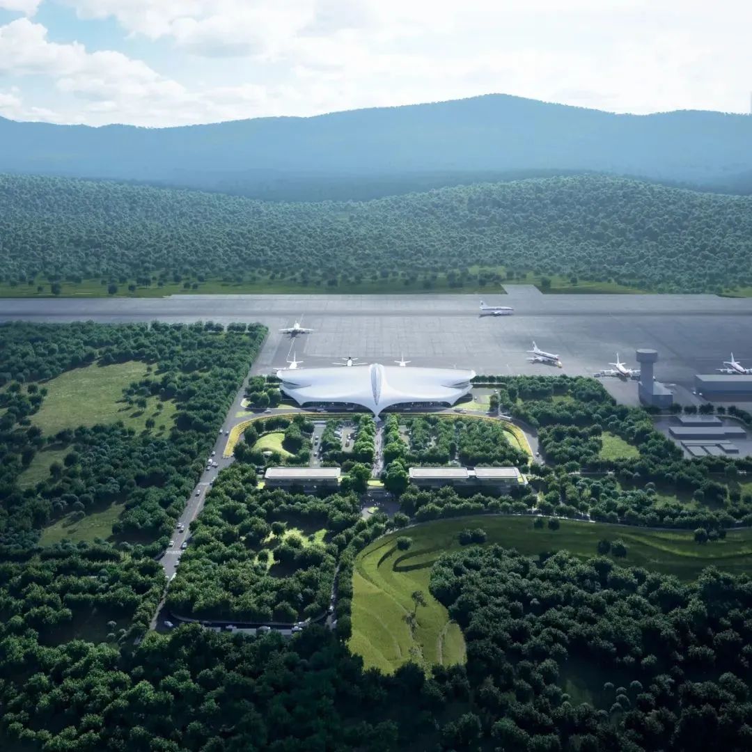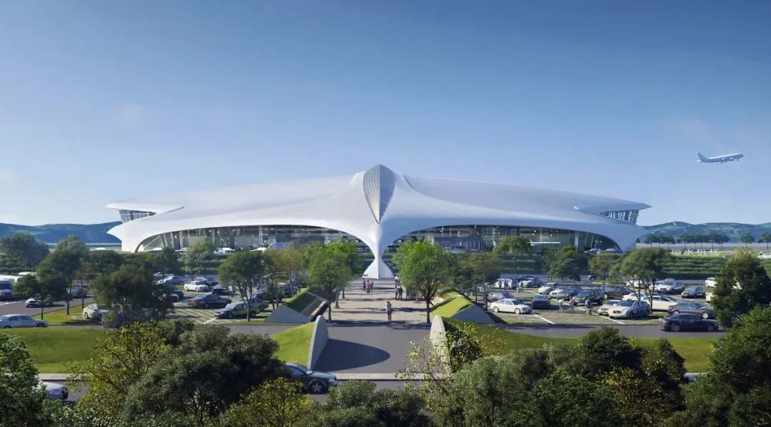 航站樓設計從麗水的綠水青山中汲取靈感,采用由鋁板局部覆蓋的大型銀白色懸挑屋頂,形似棲落于山林間的白羽飛鳥,蓄勢待發,即將翱翔于云霄。