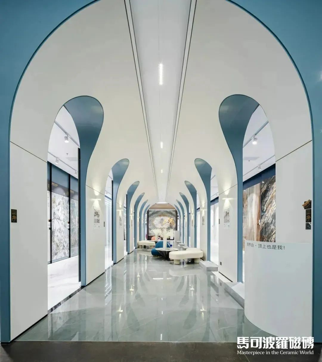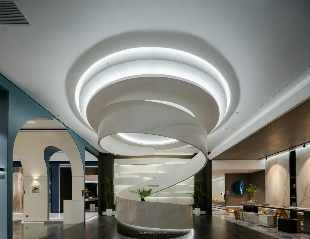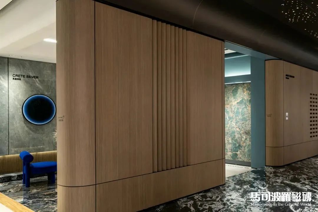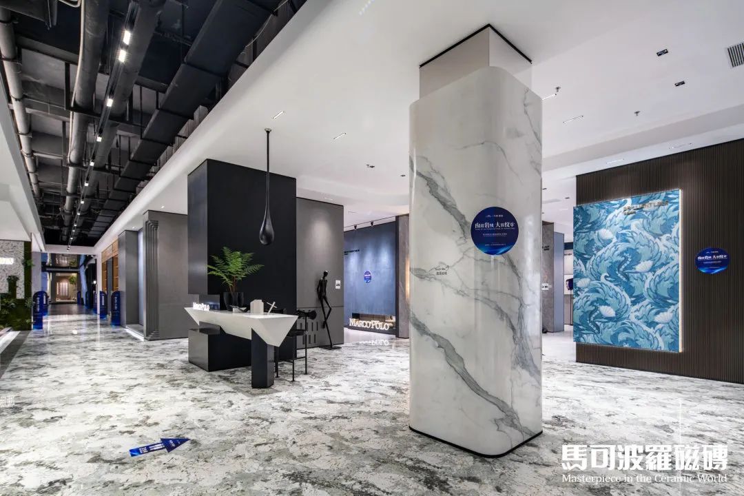 大廳中央赫然挺立的數座馬可波羅曲面巖板方柱是空間的“絕對主角”,不僅曲線優美、紋理連貫,還成功突破了直面材料的束縛,形成協調一致、渾然天成的視覺觀感。
