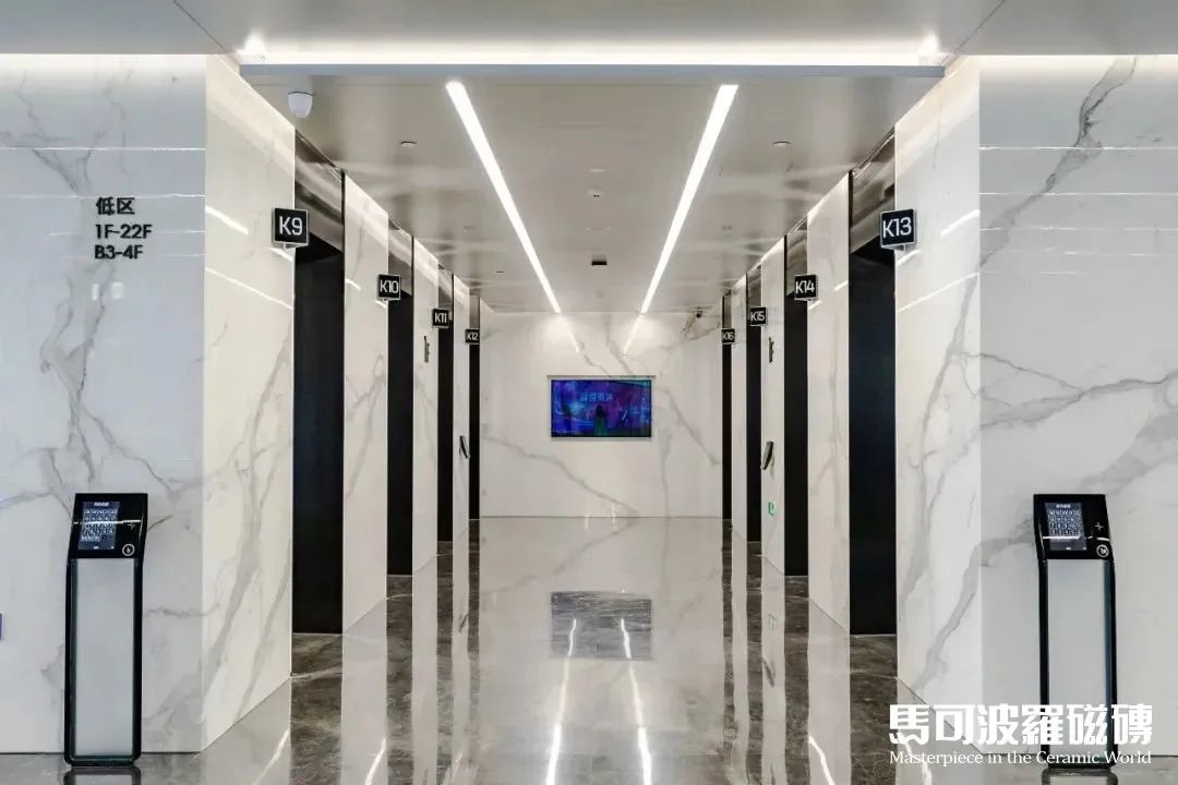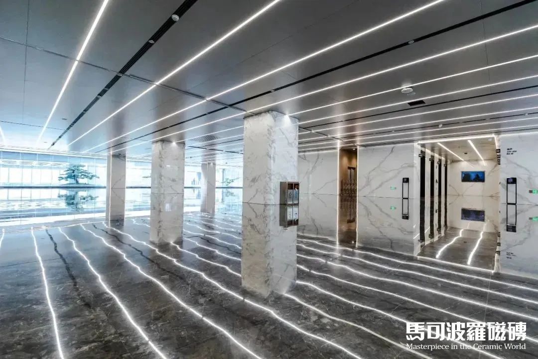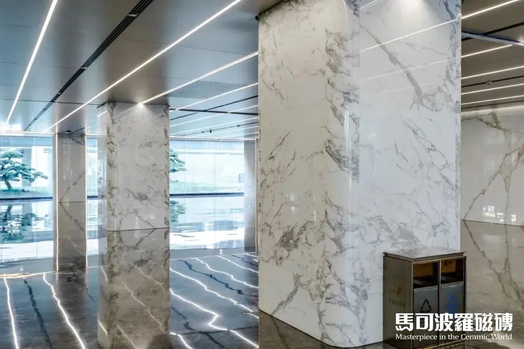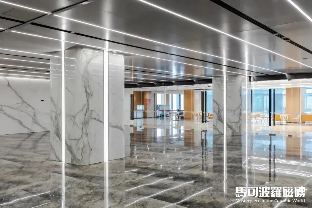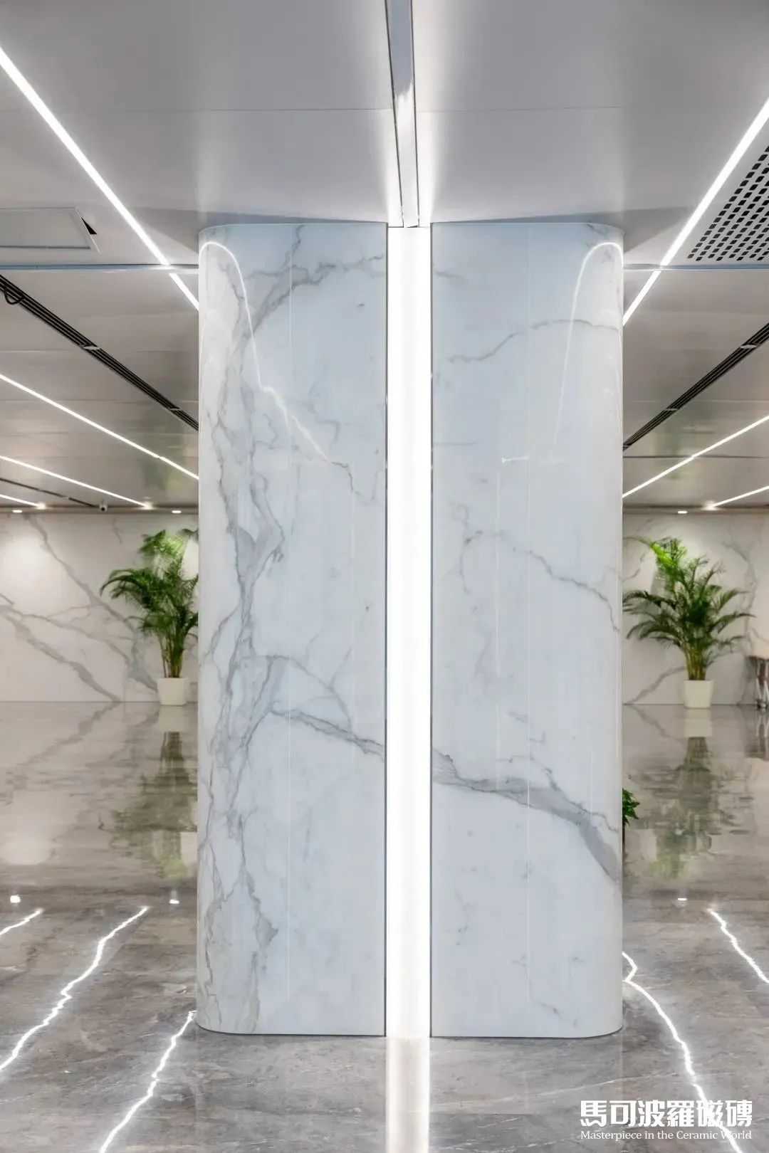 大廳色彩清晰明快,頂部均勻分布的線型燈帶讓整個空間更加具有科技感,由馬可波羅曲面巖板打造的方柱將空間的高級氛圍進一步提升。墻面使用馬可波羅巖板輕紗魚肚白定制連紋產品,1600×3200mm超大規格,使得產品紋理更加完整,且留縫少,實現原生態無界視覺效果。