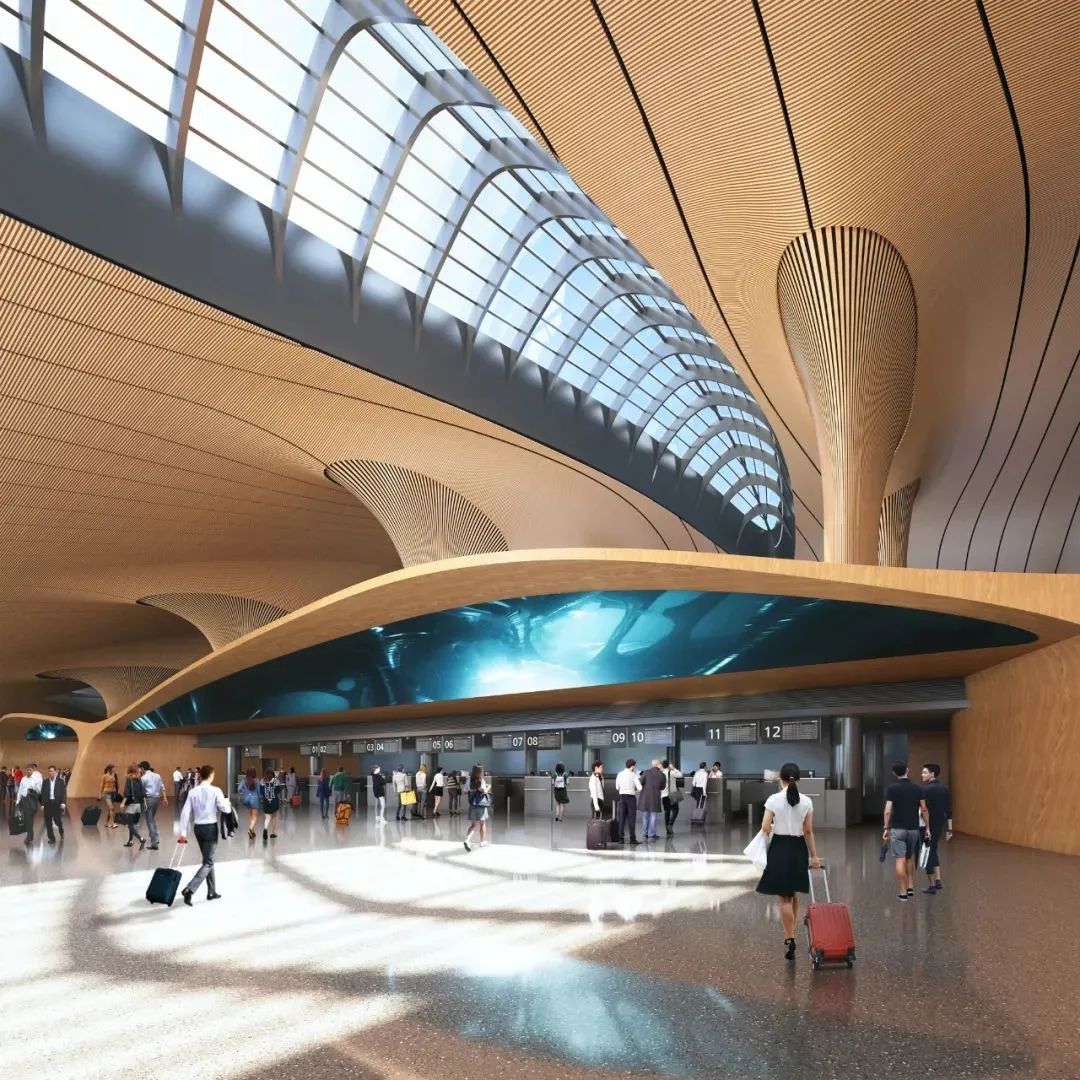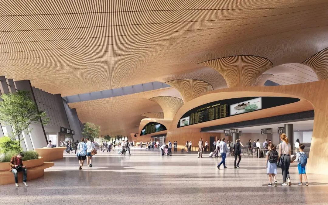 航站樓室內部,溫暖的木色調大廳空間形態靈動流暢、尺度舒適宜人。中央最高處的梭形采光天窗,將首層大廳和二層候機廳兩個主要空間合二為一,也將天窗之上的藍天白云引入室內。