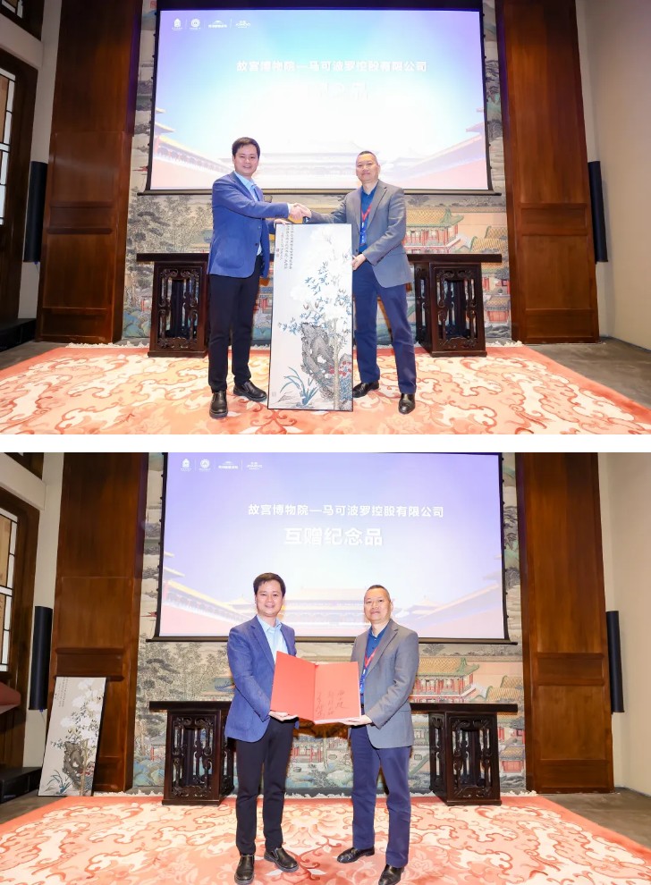 隨后,故宮博物院黨委副書記、副院長羅先良與馬可波羅控股股份有限公司總裁謝悅增分別代表故宮博物院、馬可波羅控股股份有限公司互贈紀念品。謝總代表公司向故宮博物院贈上了由中國建筑陶瓷博物館出品的文化雕刻磚《玉堂芝蘭圖》。