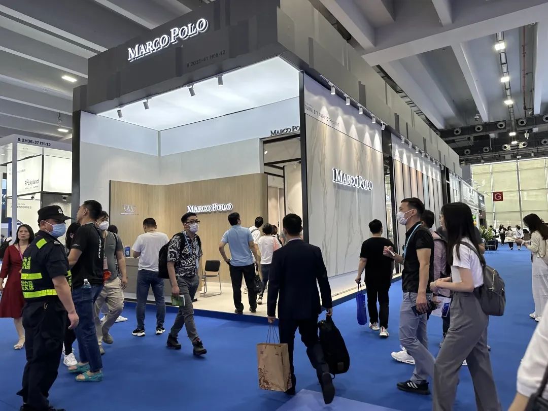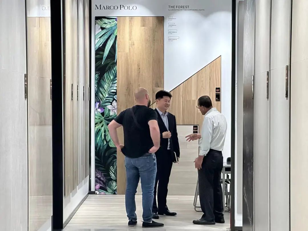 展館中的燈光與馬可波羅瓷磚2023年新品交相輝映,吸引了眾多國內(nèi)外客商駐足品鑒,感受產(chǎn)品柔雅舒適的光感和溫潤如玉的觸感。