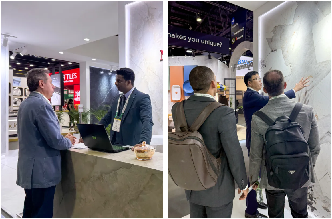 馬可波羅“印象敦煌”系列、2024年真石3.0臻系列自然舒適的產品裝飾效果與優雅獨特的藝術美感,令眾多往來客商駐足參觀問詢,并親手觸摸體驗,領略中國陶瓷的風采魅力。