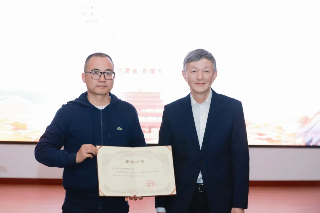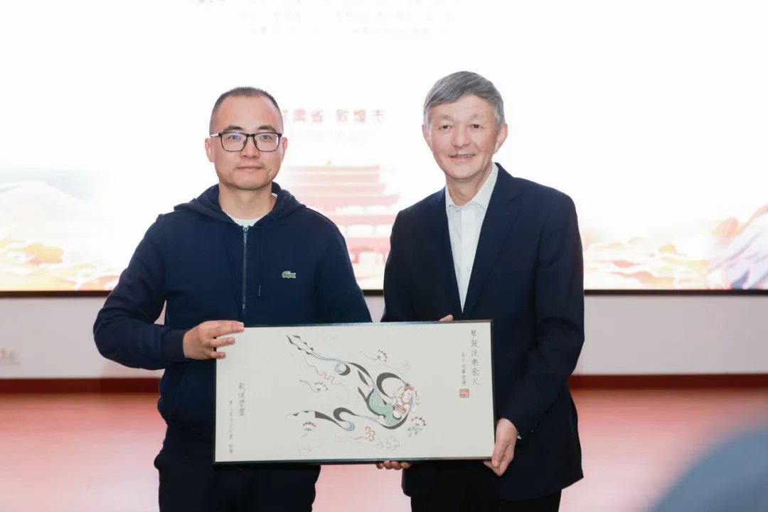 敦煌研究院院長蘇伯民向馬可波羅控股頒發捐贈證書,馬可波羅控股營銷中心市場部總監許小勇代表公司向敦煌研究院回贈了由馬可波羅控股以敦煌飛天為主題創作的手工雕刻磚紀念品。