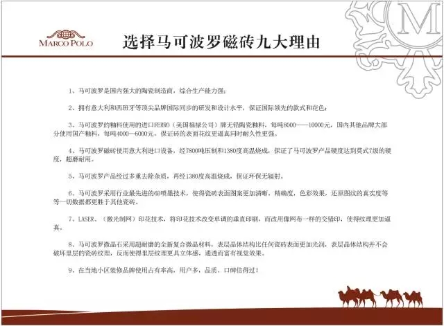 馬可波羅瓷磚產(chǎn)品卸貨細則 馬可波羅炻瓷中板墻面鋪貼施工指南 馬可波羅真石系列產(chǎn)品保養(yǎng)規(guī)范 微晶石產(chǎn)品加工要點 業(yè)主裝修必備手冊 瓷磚切割操作規(guī)范 馬可波羅瓷磚鋪貼指南 陶瓷磚上墻操作管理規(guī)范 馬可波羅好瓷磚是如何煉成的 馬可波羅產(chǎn)品使用說明書 馬可波羅瓷磚工程優(yōu)質服務承諾 產(chǎn)品質量穩(wěn)定保證 產(chǎn)品生產(chǎn)技術環(huán)保節(jié)能優(yōu)勢 瓷磚背景墻的鋪貼注意事項 品質保障 業(yè)主裝修必備手冊 來自四川隆昌地區(qū)
